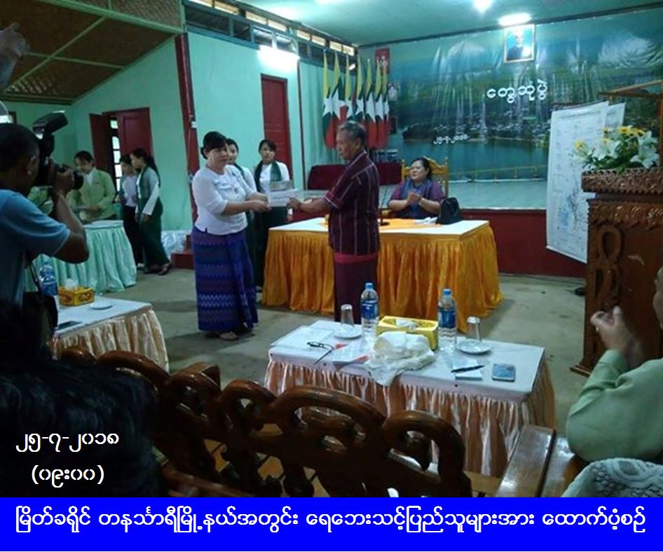 လူမှုဝန်ထမ်း၊ ကယ်ဆယ်ရေးနှင့် ပြန်လည်နေရာချထားရေးဝန်ကြီးဌာန၊ ဘေးအန္တရာယ်ဆိုင်ရာစီမံခန့်ခွဲမှုဦးစီးဌာန၊ တနင်္သာရီတိုင်းဒေသကြီးဦးစီးမှူးရုံးမှ တာဝန်ရှိသူများသည် မြိတ်ခရိုင် တနင်္သာရီမြို့နယ်အတွင်းရှိ ကျေးရွာများ၌ (၂၁-၇-၂၀၁၈) ရက်နေ့မှ (၂၂-၇-၂၀၁၈) ရက်နေ့အထိ တနင်္သာရီမြစ်ရေ ထပ်မံမြှင့်တက်မှုကြောင့် ပြောင်းရွှေ့ခဲ့သည့်အိမ်ခြေ(၄၀၇)လုံးမှ အိမ်ထောင်စု(၄၀၈)စု၊ လူဦးရေစုစုပေါင်း(၂၀၇၃)ဦးအတွက် ဆန်ဘိုး(၇)ရက်စာ (၄၃၅၃၃၀၀ိ/-) အား (၂၅-၇-၂၀၁၈) ရက်နေ့၊ နံနက်(၀၉း၀၀)နာရီအချိန်တွင် တနင်္သာရီတိုင်းဒေသကြီးအစိုးရအဖွဲ့မှ ရေဘေးသင့်ပြည်သူများအား ထောက်ပံ့ပေးအပ်ခြင်းအခမ်းအနားတွင် ထောက်ပံ့ပြီးစီးပြီးဖြစ်ပါကြောင်းနှင့် ကျန်ရှိသည့်ပြောင်းရွှေ့အိမ်ထောင်စုများမှ လူဦးရေများအတွက် ဆက်လက်ထောက်ပံ့ပေးသွားမည်ဖြစ်ပါကြောင်း သိရှိရပါသည်။