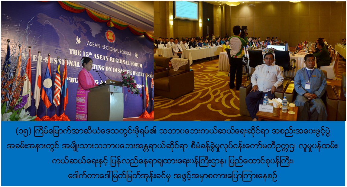 (၁၅)ကြိမ်မြောက်အာဆီယံဒေသတွင်းဖိုရမ်၏ သဘာ၀ဘေးကယ်ဆယ်ရေးဆိုင်ရာ အစည်းအဝေးဖွင့်ပွဲအခမ်းအနားကို ဖေဖော်ဝါရီလ (၂၅)ရက်နေ့၊ နံနက်(၉း၃၀)အချိန်တွင် နေပြည်တော်ရှိ သင်္ဂဟဟိုတယ်၌ကျင်းပပြုလုပ်ရာ အမျိုးသားသဘာ၀ဘေးအန္တရာယ်ဆိုင်ရာ စီမံခန့်ခွဲမှုလုပ်ငန်းကော်မတီဥက္ကဌ၊ လူမှု၀န်ထမ်း၊ ကယ်ဆယ်ရေးနှင့် ပြန်လည်နေရာချထားရေး၀န်ကြီးဌာန၊ ပြည်ထောင်စု၀န်ကြီး၊ ဒေါက်တာဒေါ်မြတ်မြတ်အုန်းခင်၊ ဒုတိယဝန်ကြီးများ၊ ပူးတွဲဥက္ကဌများဖြစ်ကြသော တရုတ်နိုင်ငံနှင့် ဂျပန်နိုင်ငံမှ ကိုယ်စားလှယ်များ၊ အာဆီယံဒေသတွင်းဖိုရမ်အဖွဲ့၀င် နိုင်ငံများမှ ကိုယ်စားလှယ်များ၊ ဌာနဆိုင်ရာအသီးသီးမှ ကိုယ်စားလှယ်များ၊ ကုလသမဂ္ဂအဖွဲ့အစည်းများ၊ နိုင်ငံတကာအစိုးရမဟုတ်သောအဖွဲ့အစည်းများနှင့် ဖွံ့ဖြိုးရေးမိတ်ဖက်အဖွဲ့အစည်းများမှ ကိုယ်စားလှယ်များ စုစုပေါင်း (၁၅၀) ဦးခန့် တက်ရောက်ကြပါသည်။