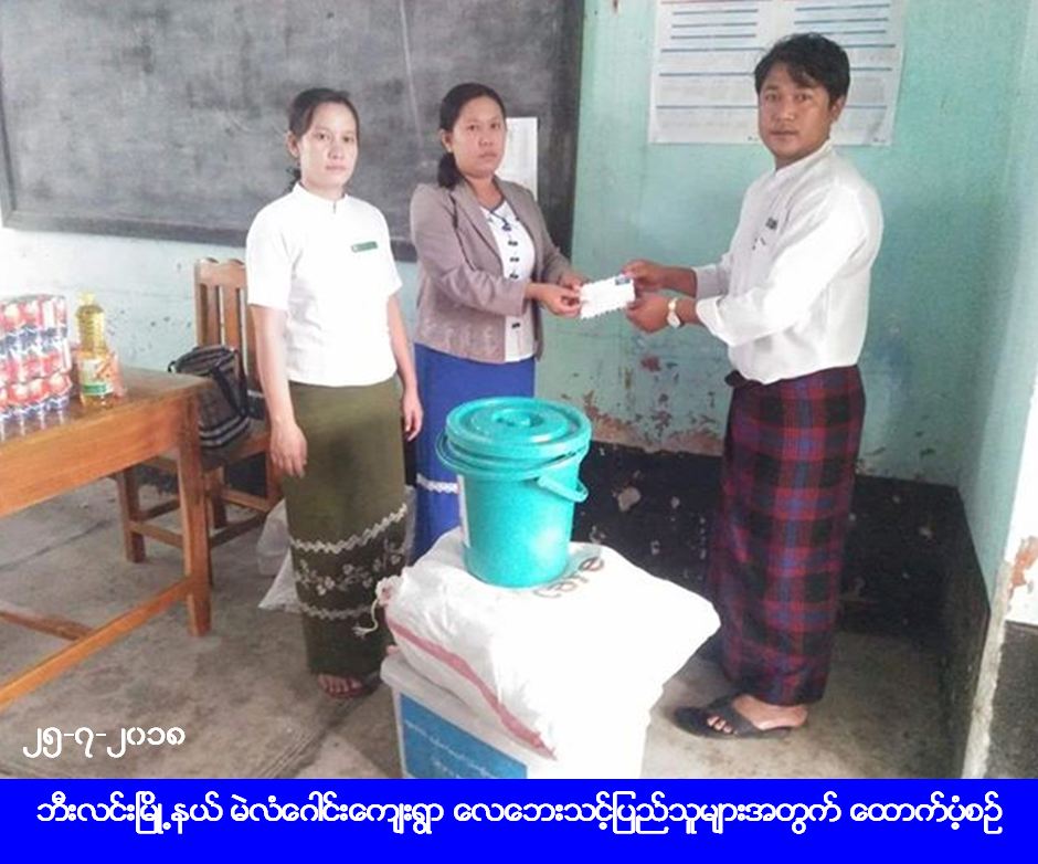 လူမှုဝန်ထမ်း၊ ကယ်ဆယ်ရေးနှင့် ပြန်လည်နေရာချထားရေးဝန်ကြီးဌာန၊ ဘေးအန္တရာယ်ဆိုင်ရာစီမံခန့်ခွဲမှုဦးစီးဌာန၊ ဘီးလင်းမြို့နယ်ဦးစီးမှူးရုံးမှ တာဝန်ရှိသူများသည် ဘီးလင်းမြို့နယ် မဲလံဂေါင်းကျေးရွာ၌ (၂၃-၇-၂၀၁၇) ရက်နေ့တွင် လေပြင်းတိုတ်ခတ်မှုကြောင့် ပြိုကျခဲ့သည့်နေအိမ်(၁)လုံးအတွက် အိမ်ဆောက်ပစ္စည်းဖိုးငွေ (၁၀၀၀၀၀ိ/-)၊ လူဦးရေ (၇) ဦးအတွက် ဆန်ဖိုးငွေ(၇)ရက်စာ (၁၄၇၀၀ိ/-) ထောက်ပံ့ငွေစုစုပေါင်း (၁၁၄၇၀၀ိ/-) တို့အားလည်းကောင်း ကယ်ဆယ်ရေးပစ္စည်း(၁၅)မျိုး၊ Family kit (၁)၊ ရေပုံးအဖုံးပါ(၂)ပုံးတို့အား (၂၅-၇-၂၀၁၈) ရက်နေ့ (၁၆း၀၀) နာရီချိန်တွင် ဘီးလင်းမြို့နယ်အထွေထွေအုပ်ချုပ်ရေးဦးစီးဌာနမှ ဒုတိယဦးစီးမှူးနှင့် ကျေးရွာအုပ်ချုပ်ရေးမှူးထံသို့ လွှဲပြောင်းပေးအပ်ခဲ့ကြောင်း သိရှိရပါသည်။