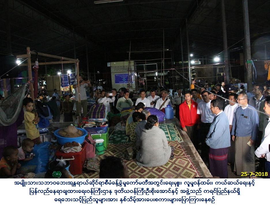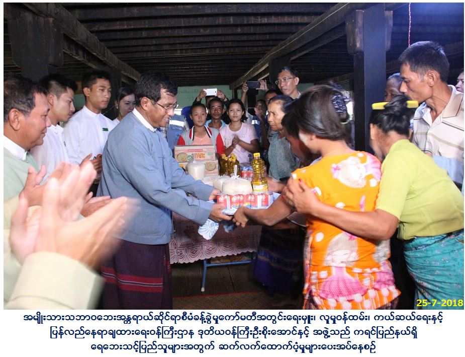 မွန်ပြည်နယ်နှင့် ကရင်ပြည်နယ်အတွင်း ဒေသကွက်၍ ရေကြီးရေလျှံမှုများဖြစ်ပေါ်နေခြင်းကြောင့် ရေဘေးရှောင်ပြည်သူများအား တွေ့ဆုံအား ပေးထောက်ပံ့နိုင်ရန် ရောက်ရှိနေသည့် အမျိုးသားသဘာဝဘေးအန္တရာယ်ဆိုင်ရာစီမံခန့်ခွဲမှုကော်မတီအတွင်းရေးမှူး၊ လူမှုဝန်ထမ်း၊ ကယ်ဆယ်ရေး နှင့်ပြန်လည်နေရာချထားရေးဝန်ကြီးဌာန ဒုတိယဝန်ကြီးဦးစိုးအောင်နှင့်အဖွဲ့သည် (၂၅-၇-၂၀၁၈)ရက်နေ့ ညနေပိုင်းတွင် ကရင်ပြည်နယ်၊ ကျုံဒိုးမြို့သို့ ဆက်လက်သွားရောက်ခဲ့ပြီး ဓမ္မသုခ ဘုန်းတော်ကြီးကျောင်းတွင် ရေဘေးတိမ်းရှောင်နေသည့် အိမ်ထောင်စု(၂၀)စုရှိ ပြည်သူ (၁၀၁)ဦးအား တွေ့ဆုံ အားပေးကာ ဆန်ရိက္ခာဖိုးငွေ၊ မိသားစုအလိုက် ဆီ၊ ငါးသေတ္တာ၊ ကြက်ဥ၊ ခေါက်ဆွဲခြောက်တို့အား ထောက်ပံ့ခြင်း၊ ကလေးငယ်များအတွက် မုန့်များပေး အပ်ခြင်း၊ ဒေသခံတာဝန်ရှိသူများ၊ ရပ်မိရပ်ဖများနှင့် ဒေသခံပြည်သူများ၏ လိုအပ်ချက်များကို ပေါင်းစပ်ညှိနှိုင်း ဆောင်ရွက်ပေးခဲ့ပါသည်။