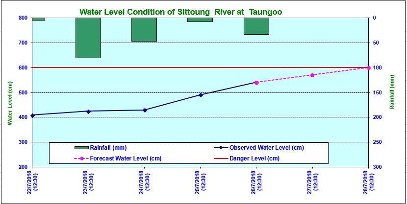 ၂၀၁၈ ခုနှစ်၊ ဇူလိုင်လ (၂၆)ရက်နေ့၊ မြန်မာစံတော်ချိန် (၁၃:၀၀) နာရီချိန်တွင် မိုးလေဝသနှင့်ဇလဗေဒ ညွန်ကြားမှုဦးစီးဌာနမှ မြစ်ရေကြီးခြင်းသတိပေးချက် ကိုအောက်ပါအတိုင်းထုတ်ပြန်ထားပါသည်။