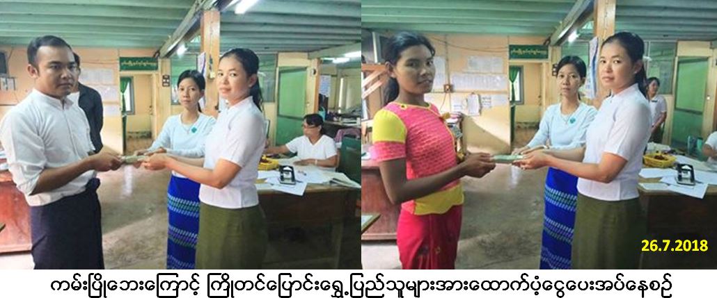 ဆင်တဲအုပ်စု၊ စမ်းပေါက်ချောင်းကျေးရွာ၌ (၂၂-၇-၂၀၁၈) ရက်နေ့တွင် ဧရာဝတီမြစ်ရေတိုက်စား၍ ကမ်းပါးပြိုမှုကြောင့် ကြိုတင်ပြောင်းရွှေ့နေအိမ် (၂) လုံး အားလည်းကောင်း စုစုပေါင်း ကြိုတင်ပြောင်းရွှေ့နေအိမ် (၅) လုံးအတွက် အိမ်ဆောက်ပစ္စည်းဖိုး ထောက်ပံ့ငွေ (၅၀၀,၀၀၀ိ/-) ကျပ်အား (၂၆-၇-၂၀၁၈) ရက်နေ့ နေ့လည် (၁၄း၀၀) နာရီအချိန်တွင် ပန်းတောင်းမြို့နယ်အထွေထွေအုပ်ချုပ်ရေးဦးစီးဌာနရုံး၌ ကျေးရွာအုပ်ချုပ်ရေးမှူးများနှင့်အတူ ပြည်သူများလက်ဝယ်သို့ ထောက်ပံ့ ပေးအပ်ခဲ့ကြောင်းသတင်းရရှိပါသည်။