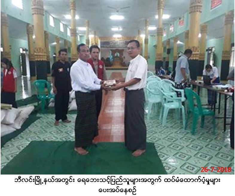 လူမှုဝန်ထမ်း၊ ကယ်ဆယ်ရေးနှင့်ပြန်လည်နေရာချထားရေးဝန်ကြီးဌာန၊ ဘေးအန္တရာယ်ဆိုင်ရာစီမံခန့်ခွဲမှုဦးစီးဌာန၊ မွန်ပြည်နယ်ဦးစီးမှူးရုံးမှ တာဝန်ရှိသူများသည် ဘီးလင်းမြို့နယ်၊ မြို့ပေါ်ရပ်ကွက် (၅)ကွက်နှင့် ကျေးရွာ (၅)ရွာရှိ ကယ်ဆယ်ရေးစခန်း(၁၉)ခုသို့ (၂၆-၇-၂၀၁၈)ရက်နေ့ တွင် ဘီးလင်းမြို့နယ်၊ သာသနာ့ဗိမာန်၌ ထပ်တိုးရေဘေးရှောင်ပြည်သူ အိမ်ထောင်စု (၃၁၁)စု၊ လူဦးရေ (၁၃၇၁)ဦးအတွက် (၇)ရက်စာ ဆန်ဖိုးငွေ(၂၈၇၉၁၀၀ိ/-) ကျပ်အား (၂၆-၇-၂၀၁၈)ရက်နေ့တွင် ရေဘေးရှောင်ပြည်သူများထံ ထောက်ပံ့ပေးအပ်ခဲ့ရာ ယခုချိန်အထိ စုစုပေါင်း အိမ်ထောင်စု (၅၇၀)စု၊ လူဦးရေ (၂၄၂၄)ဦးအတွက် ဆန်ဖိုးငွေ (၇)ရက်စာ (၅,၀၆၉,၄၀၀/-)ကျပ်ရှိနေပြီဖြစ်ကြောင်း သတင်းရရှိပါသည်။