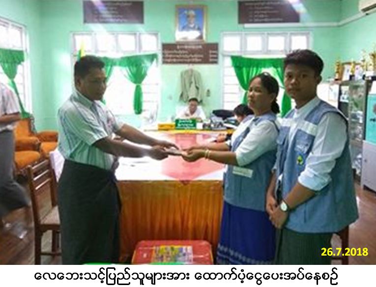လူမှုဝန်ထမ်း၊ ကယ်ဆယ်ရေးနှင့် ပြန်လည်နေရာချထားရေးဝန်ကြီးဌာန၊ ဘေးအန္တရာယ်ဆိုင်ရာစီမံခန့်ခွဲမှုဦးစီးဌာန၊ ဖျာပုံခရိုင်ဦးစီးမှူးရုံးမှတာဝန်ရှိသူများသည် ဘိုကလေးမြို့နယ်၊ ကျွန်းညိုကြီးကျေးရွာအုပ်စု၊ ကျားချောင်းကျေးရွာ၌ (၁၆-၇-၂၀၁၈) ရက်နေ့တွင် ဖြစ်ပွားခဲ့သော လေဘေးကြောင့် နေအိမ် (၁) လုံးပြိုကျပျက်စီးခဲ့ပြီး အိမ်ထောင်စု (၁) စုမှ လူဦးရေ (၄) ဦးဘေးသင့်ခဲ့ရာ အဆိုပါဘေးသင့်ပြည်သူများအတွက် (၂၆-၇-၂၀၁၈) ရက်နေ့တွင် အိမ်ဆောက်ပစ္စည်းဖိုးထောက်ပံ့ငွေ (၁) သိန်းကျပ်၊ ဆန်ရိက္ခာဖိုး (၈,၄၀၀) ကျပ်နှင့် ကယ်ဆယ်ရေးပစ္စည်း (၁၅) မျိုး (၁) အိမ်ထောင်စာအား မြို့နယ်အထွေထွေအုပ်ချုပ်ရေးဦးစီးဌာနရုံးခန်းမ၌ သက်ဆိုင်ရာတာဝန်ရှိသူများရှေ့မှောက်တွင် လက်ဝယ်အရောက် သွားရောက်ထောက်ပံ့ပေးအပ်ခဲ့ကြောင်း သတင်းရရှိပါသည်။