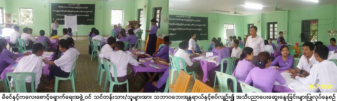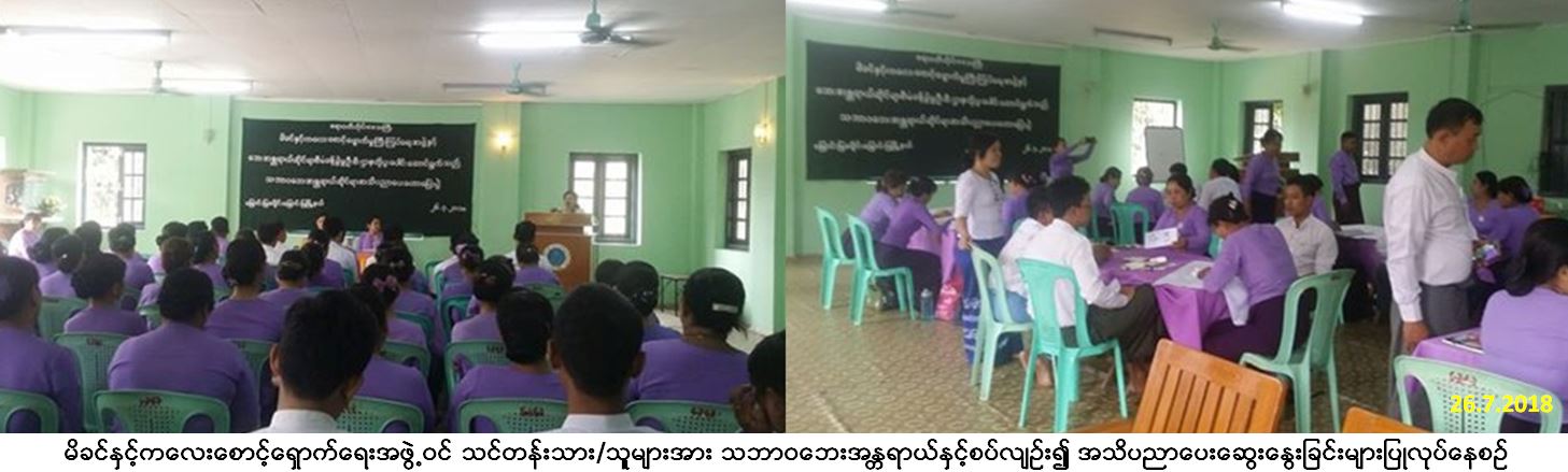 လူမှုဝန်ထမ်း၊ ကယ်ဆယ်ရေးနှင့် ပြန်လည်နေရာချထားရေးဝန်ကြီးဌာန၊ ဘေးအန္တရာယ်ဆိုင်ရာစီမံခန့်ခွဲမှုဦးစီးဌာန၊ မြောင်းမြခရိုင်ဦးစီးမှူးရုံးမှတာဝန်ရှိသူများသည် ဧရာဝတီတိုင်းဒေသကြီး မိခင်နှင့်ကလေးစောင့်ရှောက်မှုကြီးကြပ်ရေးအဖွဲ့နှင့် ပူးပေါင်း၍ (၂၆-၇-၂၀၁၈) ရက်နေ့၊ နံနက် (၀၉း၀၀) နာရီအချိန်မှ (၁၆း၃၀) နာရီအချိန်ထိ မြောင်းမြမြို့နယ်၊ အိမ်မဲမြို့နယ်၊ ဝါးခယ်မမြို့နယ်၊ မော်လမြိုင်ကျွန်းမြို့နယ်နှင့် လပွတ္တာမြို့နယ်တို့မှ မိခင်နှင့်ကလေးစောင့်ရှောက်ရေးအဖွဲ့ဝင် သင်တန်းသား/ သူများအား သဘာဝဘေးအန္တရာယ်နှင့်စပ်လျဉ်း၍ အသိပညာပေးဆွေးနွေးခြင်းများ ပြုလုပ်ခဲ့ရာ သင်တန်းသား/သူ (၃၀) ဦးတက်ရောက်ခဲ့ပြီး တက်ရောက်လာသူ များအား လက်ကမ်းစာစောင်များဝေငှခဲ့ကြောင်း သတင်းရရှိပါသည်။