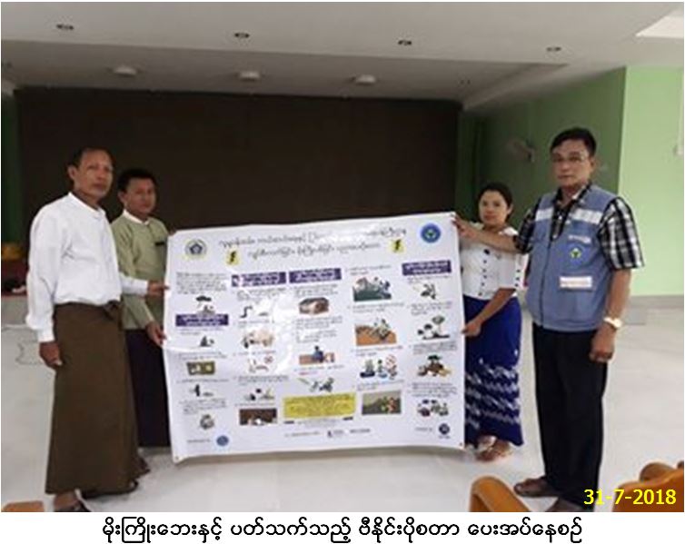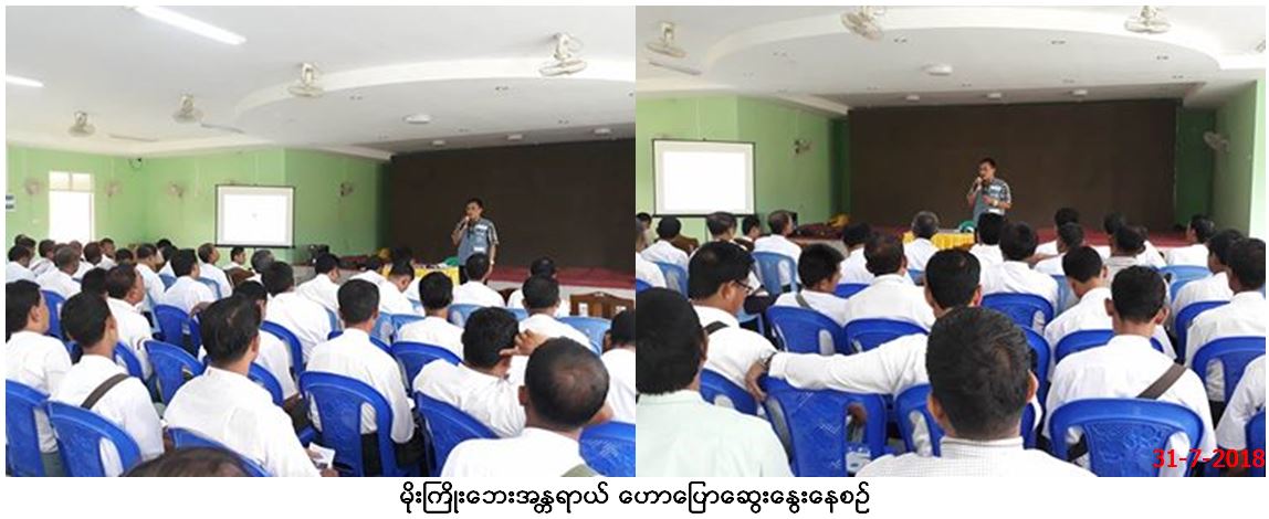 လူမှုဝန်ထမ်း၊ ကယ်ဆယ်ရေးနှင့် ပြန်လည်နေရာချထားရေးဝန်ကြီးဌာန၊ ဘေးအန္တရာယ်ဆိုင်ရာစီမံခန့်ခွဲမှုဦးစီးဌာန၊ ရခိုင်ပြည်နယ်ဦးစီးမှူးရုံးမှ တာဝန်ရှိသူများသည် (၃၁-၇-၂၀၁၈) ရက်နေ့တွင် (၁၃း၀၀)နာရီမှ (၁၄း၃၀)နာရီအထိ စစ်တွေမြို့၊ မြို့နယ်အထွေထွေအုပ်ချုပ်ရေးဦးစီးဌာန၊ အစည်းအဝေးခန်းမ၌ ဒုတိယမြို့နယ်အုပ်ချုပ်ရေးမှူးနှင့် ကျေးရွာအုပ်ချုပ်ရေးမှူး(၁၂၀)ဦးတို့အား မိုးကြိုးဘေးအန္တရာယ်ဟောပြောဆွေးနွေး ခဲ့ပြီး၊ တက်ရောက်လာသူများအား လက်ကမ်းစာစောင်များ၊ နံရပ်ကပ်ပိုစတာများနှင့် ဗီနိုင်းပိုစတာများ ဖြန့်ဝေခဲ့ကြောင်း သတင်းရရှိပါသည်။