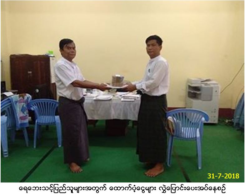 လူမှုဝန်ထမ်း၊ ကယ်ဆယ်ရေးနှင့်ပြန်လည်နေရာချထားရေးဝန်ကြီးဌာန၊ ဘေးအန္တရာယ်ဆိုင်ရာစီမံခန့်ခွဲမှုဦးစီးဌာန၊ ကရင်ပြည်နယ်ဦးစီးမှူးရုံးမှ တာဝန်ရှိသူများသည် (၂၂-၇-၂၀၁၈)ရက်နေ့တွင် ကရင်ပြည်နယ်၊ ဘားအံမြို့နယ်ရှိ သံလွင်မြစ်ရေမြင့်တက်မှု ကြောင့် ဘားအံမြို့နယ်၌ ကယ်ဆယ်ရေးစခန်း (၁၆)ခု ဖွင့်လှစ်၍ အိမ်ထောင်စု (၁၄၂၄)စု လူဦးရေ (၆၈၅၆)ဦးအတွက် ဆန်ရိက္ခာ (၇)ရက်စာ ထောက်ပံ့ငွေ (၁၄,၃၉၇,၆၀၀/-)ကျပ်အား (၃၁-၇-၂၀၁၈)ရက်နေ့တွင် ဘားအံမြို့နယ် အထွေထွေအုပ်ချုပ်ရေးဦးစီးဌာနသို့ လွှဲပြောင်း ထောက်ပံ့ပေးအပ်ခဲ့ပါကြောင်း သတင်းရရှိပါသည်။