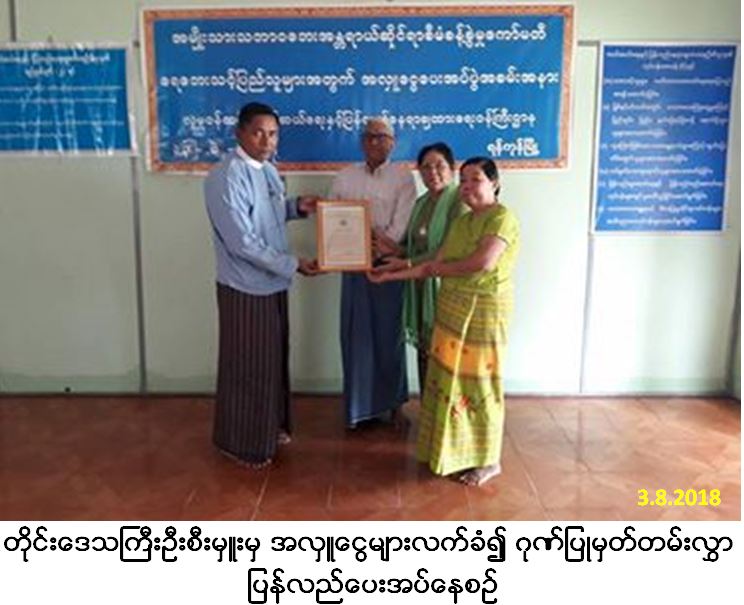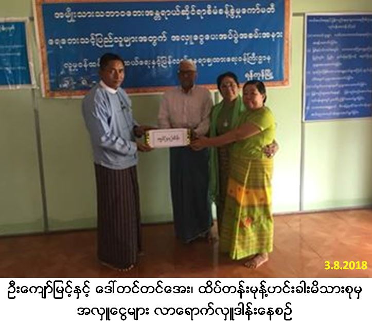 မွန်ပြည်နယ်အတွင်း ရေရှားပါးသည့်ဒေသ၌ စက်ရေတွင်း (၁) တွင်းတူးဖော်ရန်နှင့် ရေဂါလံ (၂,၀၀၀) ဆံ့အုတ်ရေကန် (၁) လုံး ပြုလုပ်ရန်အတွက် (၃-၈-၂၀၁၈) ရက်နေ့၊ နံနက်ပိုင်းတွင် အလှူရှင် ဦးကျော်မြင့်နှင့် ဒေါ်တင်တင်အေး၊ ထိပ်တန်းမုန့်ဟင်းခါးမိသားစုမှ အလှူငွေ (၄,၇၀၀,၀၀၀ိ/-) ကျပ်အား လာရောက်လှူဒါန်းရာ လူမှုဝန်ထမ်း၊ ကယ်ဆယ်ရေးနှင့် ပြန်လည်နေရာချထားရေးဝန်ကြီးဌာန၊ ဘေးအန္တရာယ်ဆိုင်ရာစီမံခန့်ခွဲမှုဦးစီးဌာန၊ ရန်ကုန်တိုင်းဒေသကြီးဦးစီးမှူးရုံး၊ တိုင်းဒေသ ကြီးဦးစီးမှူးမှ လက်ခံ၍ ဂုဏ်ပြုမှတ်တမ်းလွှာ ပြန်လည်ပေးအပ်ခဲ့ကြောင်းသတင်းရရှိပါသည်။