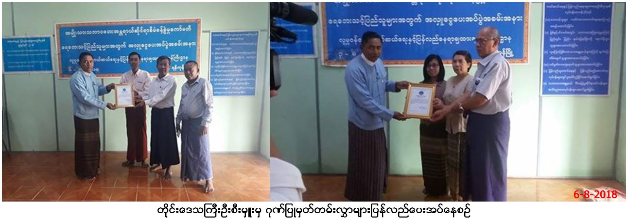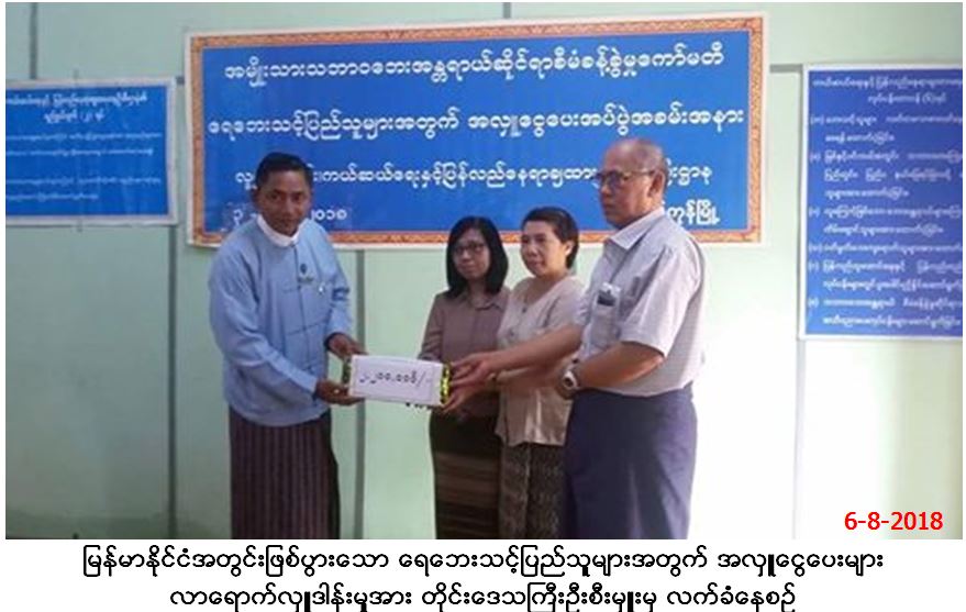 လူမှုဝန်ထမ်း၊ ကယ်ဆယ်ရေးနှင့် ပြန်လည်နေရာချထားရေးဝန်ကြီးဌာန၊ ဘေးအန္တရာယ်ဆိုင်ရာစီမံခန့်ခွဲမှုဦးစီးဌာန၊ ရန်ကုန်တိုင်းဒေသကြီး ဦးစီးမှူးရုံးမှ တာဝန်ရှိသူများသည် (၆-၈-၂၀၁၈)ရက်နေ့၊ နံနက်ပိုင်းတွင် မြန်မာနိုင်ငံအတွင်းဖြစ်ပွားသော ရေဘေးသင့်ပြည်သူများအတွက် ဓမ္မဆရာဘိက္ခုမိသားစုဝင်များကောင်းမှု(ရန်ကုန်တိုင်း၊ မန္တလေးတိုင်း၊ ရှမ်းပြည်နယ်)မှ အလှူငွေကျပ် (၂,၂၀၀,၀၀၀/-)နှင့် ယာဉ်-ဝယ်ရောင်းအကျိုးဆောင်များ၏လူမှုရေးအသင်းအဖွဲ့(ရန်ကုန်)မှ အလှူငွေကျပ်(၃,၀၀၀,၀၀၀ိ/-) စုစုပေါင်းအလှူငွေကျပ် (၅,၂၀၀,၀၀၀ိ/-)တို့အား လာရောက်လှူဒါန်းရာ တိုင်းဒေသကြီးဦးစီးမှူးမှ လက်ခံ၍ ဂုဏ်ပြုမှတ်တမ်းလွှာများပြန်လည်ပေးအပ်ခဲ့ကြောင်း သတင်းရရှိပါသည်။