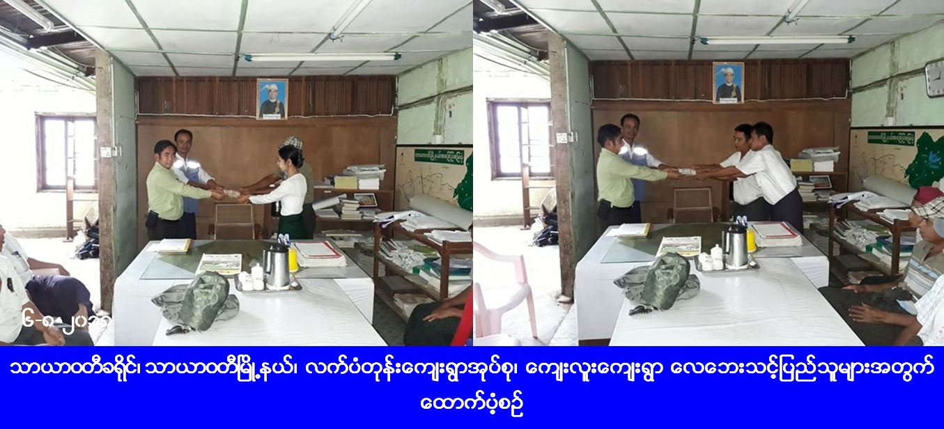 လူမှုဝန်ထမ်း၊ ကယ်ဆယ်ရေးနှင့် ပြန်လည်နေရာချထားရေးဝန်ကြီးဌာန၊ ဘေးအန္တရာယ်ဆိုင်ရာစီမံခန့်ခွဲမှုဦးစီးဌာန၊ ပြည်ခရိုင်ဦးစီးမှူးရုံးမှ တာဝန်ရှိသူများသည် သာယာဝတီခရိုင်၊ သာယာဝတီမြို့နယ်၊ လက်ပံတုန်းကျေးရွာအုပ်စု၊ ကျေးလူးကျေးရွာ၌ (၂၆-၇-၂၀၁၈) ရက်နေ့တွင် လေဘေးကြောင့် တစ်စိတ်တစ်ပိုင်းပျက်စီးခဲ့သည့် နေအိမ်(၇)လုံးအတွက် တန်ဖိုးသင့်နှုန်းထားဖြင့် စုစုပေါင်းထောက်ပံ့ငွေ(၇၀၀၀၀၀ိ/-) အား (၆-၈-၂၀၁၈) ရက်နေ့တွင် သာယာဝတီမြို့နယ်အထွေထွေအုပ်ချုပ်ရေးဦးစီးဌာန၌ သွားရောက်၍ ထောက်ပံ့ပေးခဲ့ကြောင်း သိရှိရပါသည်။
