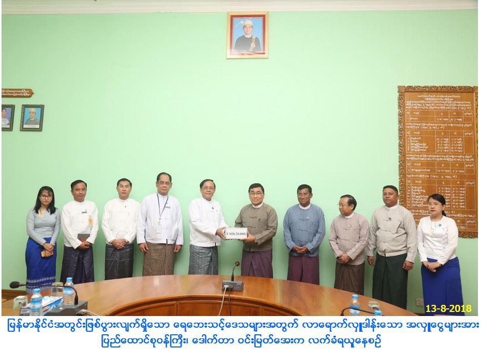 ရခိုင်ပြည်နယ်အတွင်း လူသားချင်းစာနာမှုအကူအညီ အထောက်အပံ့ပေးရေး၊ ပြန်လည်နေရာချထားရေး၊ဖွံ့ဖြိုးရေးစီမံကိန်း (UEHRD) အတွက် အမေရိကန်ပြည်ထောင်စု၊ နယူးယောက်မြို့ရှိ National Humanitarian Fundraising For Myanmar(NHFMM)က အလှူငွေ အမေရိကန် ဒေါ်လာ(၂၀,၀၀၀)နှင့် မြန်မာနိုင်ငံအတွင်း ဖြစ်ပွားလျက်ရှိသော ရေဘေးသင့်ဒေသများအတွက် ဘန်ကောက်မြို့ရှိ မြန်မာသံရုံး၊ စစ်သံရုံးဝန်ထမ်းမိသားစုများနှင့် ထိုင်းနိုင်ငံရောက်စေတနာရှင် မြန်မာလုပ်ငန်းရှင်အချို့က အလှူငွေထိုင်းဘတ်(၇၄၂,၀၀၀)ကို အပြည်ပြည် ဆိုင်ရာပူးပေါင်းဆောင်ရွက် ရေးဝန်ကြီးဌာန၊ ပြည်ထောင်စုဝန်ကြီး၊ ဦးကျော်တင်ကလည်းကောင်း၊ ချယ်ရီမေတ္တာဖောင်ဒေးရှင်းက အလှူငွေ ကျပ်(၁၅၀)သိန်းကို ဒုတိယဥက္ကဌ၊ ဦးစိုးထွန်းဇော်ကလည်းကောင်း၊ National Energy Puma Aviation Services(NEPAS) က အလှူ ငွေကျပ်သိန်း(၂၀၀)ကို စွမ်းအင်ဝန်ကြီးဌာန၊ မြန်မာ့ရေနံထွက်ပစ္စည်းရောင်းဝယ်ရေးလုပ်ငန်း၊ ဦးဆောင်ညွှန်ကြားရေးမှူး၊ ဦးသန့်စင်ဦးဆောင် သောအဖွဲ့ကလည်းကောင်း ယနေ့နံနက်ပိုင်းတွင် နေပြည်တော်ရှိ လူမှုဝန်ထမ်း၊ ကယ်ဆယ်ရေးနှင့် ပြန်လည်နေရာချထားရေးဝန်ကြီးဌာနသို့ လာရောက်ပေးအပ်လှူဒါန်းရာ ပြည်ထောင်စုဝန်ကြီး၊ ဒေါက်တာ ဝင်းမြတ်အေးက လက်ခံရယူပြီး ကျေးဇူးတင်စကားပြန်လည်ပြောကြားကာ ဂုဏ်ပြုမှတ်တမ်းလွှာများ ပြန်လည်ပေးအပ်ခဲ့ကြောင်း သတင်းရရှိပါသည်။