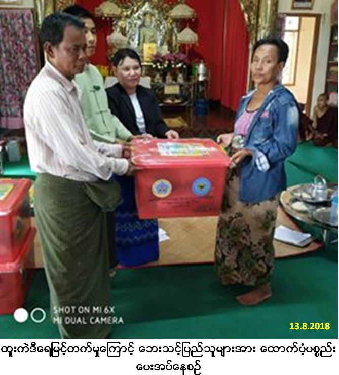 စုစုပေါင်းဘေးသင့်လူဦးရေ (၄၅) ဦးအတွက် ဆန်ရိက္ခာဖိုး (၇) ရက်စာ (၉၄,၅၀၀/-) ကျပ်၊ စုစုပေါင်းထောက်ပံ့ငွေ (၁,၂၉၄,၅၀၀/-) ကျပ်တို့အား (၁၃-၈-၂၀၁၈) ရက်နေ့တွင် စစ်တောင်းကျေးရွာ၊ ရွှေဘုန်းပွင့်ဘုန်းကြီးကျောင်း၌ ဘေးသင့်ပြည်သူများထံသို့ လက်ဝယ်အရောက် ထောက်ပံ့ပေးအပ်ခဲ့ကြောင်း သတင်းရရှိပါသည်။