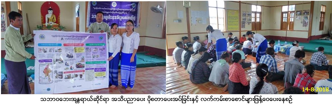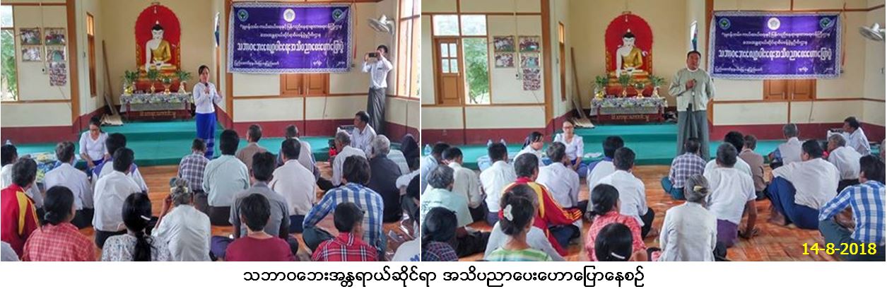 လူမှုဝန်ထမ်း၊ ကယ်ဆယ်ရေးနှင့် ပြန်လည်နေရာချထားရေးဝန်ကြီးဌာန၊ ဘေးအန္တရာယ်ဆိုင်ရာစီမံခန့်ခွဲမှုဦးစီးဌာန၊ ပြည်ထောင်စုနယ်မြေ၊ နေပြည်တော်တိုင်းဦးစီးမှူးရုံးမှ တာဝန်ရှိသူများသည် (၁၄-၈-၂၀၁၈)ရက်နေ့ (၁၀း၀၀)နာရီမှ (၁၁း၃၀)အချိန်ထိ ဥတ္တရသီရိမြို့နယ်၊ ရွှေနံသာ ရပ်ကွက်၊ အမှတ်(၁)ဓမ္မာရုံ၌ ကျေးရွာသူ/ကျေးရွာသား (၁၅၀) ဦးအား သဘာဝဘေးလျော့ပါးရေးအသိပညာပေးဟောပြောဆွေးနွေးခဲ့ပြီး လက်ကမ်းစာစောင်နှင့် ပိုစတာများဖြန့်ဝေပေးခဲ့ကြောင်း သတင်းရရှိပါသည်။