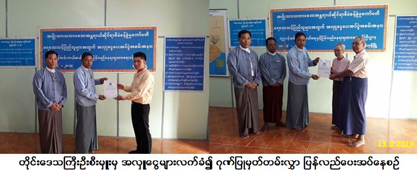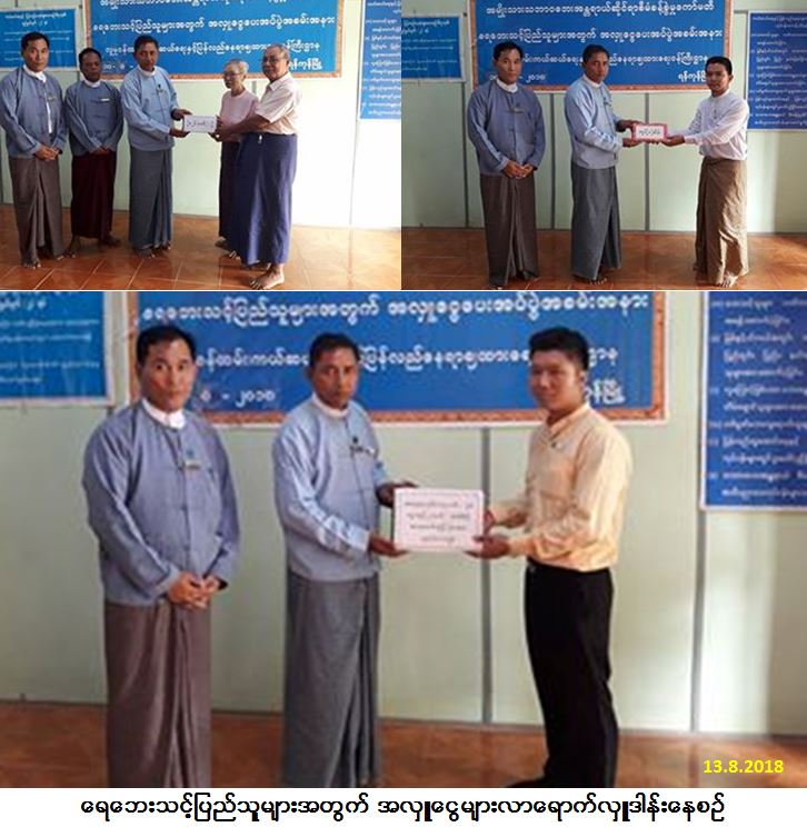 (၁၃-၈-၂၀၁၈) ရက်နေ့တွင် ရေဘေးသင့်ပြည်သူများအတွက် ဦးကျော်မောင်နှင့် ဒေါ်အုန်းကြည်မိသားစုမှ အလှူ ငွေ (၁၂၆,၀၀၀/-) ကျပ်၊ ဦးဝေလင်း (Wyne Hotel ) မှအလှူငွေ (၁၀၀,၀၀၀/-) ကျပ်၊ Wyne Hotel ဝန်ထမ်းများမှ အလှူငွေ (၁၁၅,၀၀၀/-) ကျပ်၊ အကောက်ခွန်ဝန်ထမ်းဟောင်းများအသင်းမှ အလှူငွေ (၁,၀၀၀,၀၀၀/-) ကျပ် အား လာရောက်လှူဒါန်းခဲ့ရာ လူမှုဝန်ထမ်း၊ ကယ်ဆယ်ရေးနှင့် ပြန်လည်နေရာချထားရေးဝန်ကြီးဌာန၊ ဘေးအန္တရာယ်ဆိုင်ရာစီမံခန့်ခွဲမှုဦးစီးဌာန၊ ရန်ကုန်တိုင်းဒေသကြီးဦးစီးမှူးရုံး၊ တိုင်းဒေသကြီးဦးစီးမှူးနှင့် တာဝန်ရှိ သူများမှလက်ခံ၍ ဂုဏ်ပြုမှတ်တမ်းလွှာ ပြန်လည်ပေးအပ်ခဲ့ကြောင်း သတင်းရရှိပါသည်။