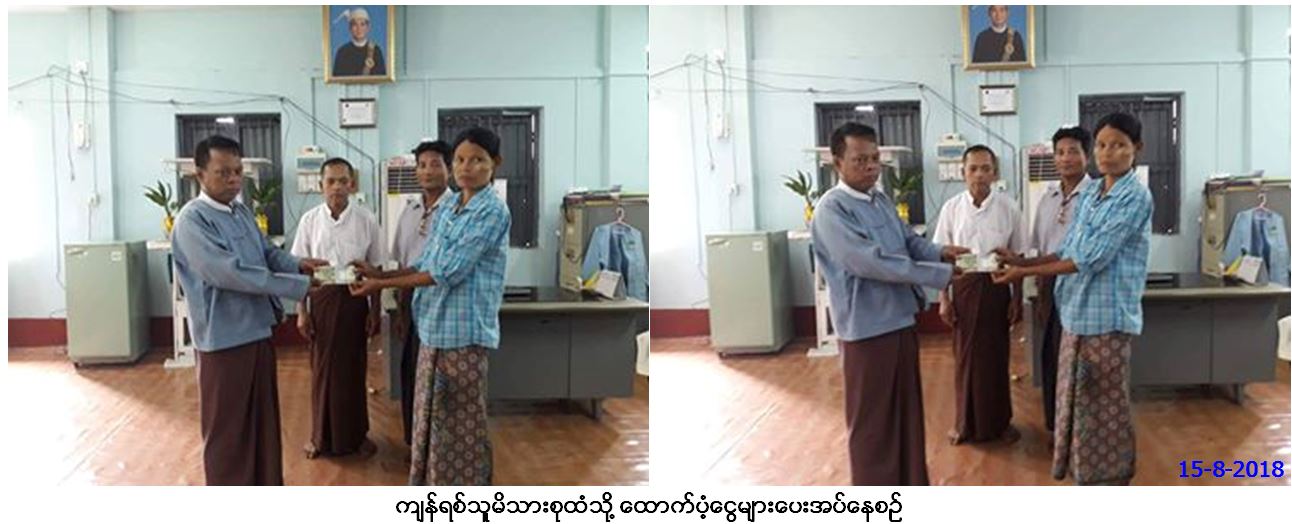 လူမှုဝန်ထမ်း၊ ကယ်ဆယ်ရေးနှင့် ပြန်လည်နေရာချထားရေးဝန်ကြီးဌာန၊ ဘေးအန္တရာယ်ဆိုင်ရာစီမံခန့်ခွဲမှုဦးစီးဌာန၊ ရန်ကုန်တိုင်းဒေသကြီးဦးစီး မှူးရုံးမှ တာဝန်ရှိသူများသည် လှည်းကူးမြို့နယ်၊ ဒါးပိန်ရွာမိုးကြိုးဘေးထောက်ပံ့မှု (၈.၈.၂၀၁၈)ရက်နေ့တွင် ရန်ကုန်တိုင်းဒေသကြီး ၊ လှည်းကူး မြို့နယ်၊ ဒါးပိန်(မြောက်)ကျေးရွာအုပ်စု၊ ဘုရားကွင်းကျေး ရွာနေဦးခင်ကြိုင်၊ အသက်(၄၈)နှစ်သည် ၎င်းပိုင်နွား(၁)ကောင်အားဆွဲ၍ နေအိမ် သို့ပြန်လာ စဉ်ဒါးပိန်(တောင်)ကျေးရွာအုပ်စု၊ သုသာန်အနီးတွင် မိုးကြိုးပစ်ခံရပြီး သေဆုံးသွားသဖြင့်၊ (၁၅.၈.၂၀၁၈)ရက်နေ့တွင် ကျန်ရစ်သူ မိသားစုထံသို့ သေဆုံးထောက်ပံ့ငွေ (၃၀၀,၀၀၀/-)ကျပ်အား ထောက်ပံ့ပေးခဲ့ကြောင်း သတင်းရရှိပါသည်။