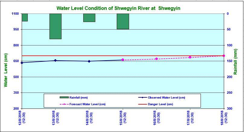 ၂၀၁၈ ခုနှစ်၊ သြဂုတ်လ (၁၅)ရက်နေ့၊ မြန်မာစံတော်ချိန် (၁၄:၀၀) နာရီအချိန်တွင် မိုးလေဝသနှင့်ဇလဗေဒညွန်ကြားမှုဦးစီးဌာနမှ မြစ်ရေကြီးခြင်းသတိပေးချက်ကိုအောက်ပါအတိုင်း ထုတ်ပြန်ထားပါသည်။