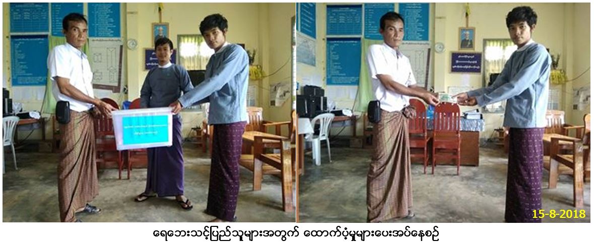 လူမှုဝန်ထမ်း၊ ကယ်ဆယ်ရေးနှင့် ပြန်လည်နေရာချထားရေးဝန်ကြီးဌာန၊ ဘေးအန္တရာယ်ဆိုင်ရာစီမံခန့်ခွဲမှုဦးစီးဌာန၊ ကော့သောင်းခရိုင်ဦးစီး မှူးရုံးမှ တာဝန်ရှိသူများသည် (၁၄.၈.၂၀၁၈)ရက်နေ့တွင် ကော့သောင်းမြို့နယ်၊ ချမ်းဖန်းကျေးရွာအုပ်စု၊ မပုတေးကျေးရွာ၌ မိုးသည်းထန်စွာ ရွာသွန်း၍ မြစ်ရေကြီးပြီး လှိုင်းပုတ်ခတ်မှုကြောင့် ရေဘေးသင့်ခဲ့သော ပြိုလဲနေအိမ် (၁)အိမ်လုံးအတွက် အိမ်ဆောက်ပစ္စည်းဖိုး (၁၀၀,၀၀၀/-)ကျပ် အဆိုပါအိမ်ထောင်စု (၁)စုမှ ဘေးသင့်လူဦးရေ (၈)ဦးအတွက် ဆန်ဖိုးရန်ပုံငွေ (၁၆,၈၀၀/-) စုစုပေါင်းငွေကျပ် (၁၁၆,၈၀၀/-)ကျပ် နှင့်အတူ ကယ်ဆယ်ရေးပစ္စည်း (၁၅)မျိုးစီတို့အား (၁၅.၈.၂၀၁၈) ရက်နေ့ (၁၁း၃၀) အချိန်တွင် ထောက်ပံ့ပေးအပ်ခဲ့ကြောင်း သတင်းရရှိပါ သည်။