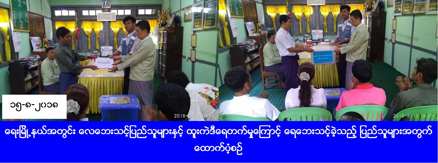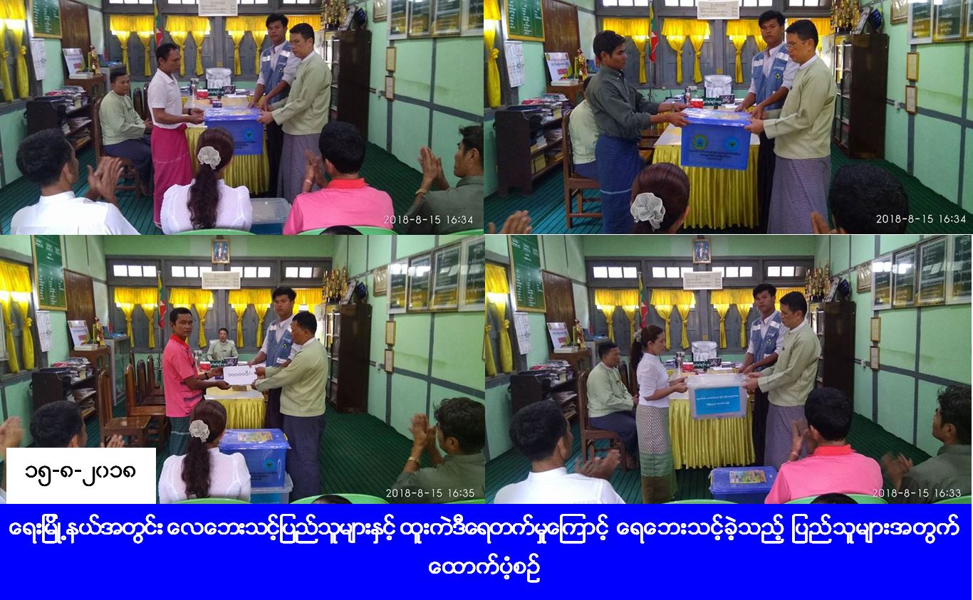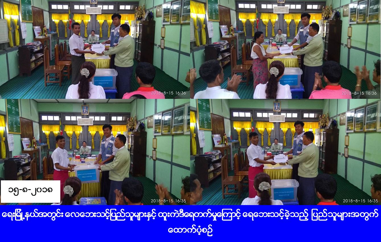 လူမှုဝန်ထမ်း၊ ကယ်ဆယ်ရေးနှင့် ပြန်လည်နေရာချထားရေးဝန်ကြီးဌာန၊ ဘေးအန္တရာယ်ဆိုင်ရာစီမံခန့်ခွဲမှုဦးစီးဌာန၊ ရေးမြို့နယ်ဦးစီးမှူးရုံးမှ တာဝန်ရှိသူများသည် ရေးမြို့နယ် ကော့လှိုင်ကျေးရွာ၌ (၁၃-၈-၂၀၁၈) ရက်နေ့တွင် လေပြင်းတိုက်ခတ်မှုကြောင့် တစ်စိတ်တစ်ပိုင်းပျက်စီးခဲ့သည့် လူနေအိမ် (၃) လုံးအတွက် ကယ်ဆယ်ရေးပစ္စည်း (၁၁) မျိုး (၃) အိမ်ထောင်စာ၊ အိမ်ဆောက်ပစ္စည်းဖိုးငွေ (၁၂၈၀၀၀) ကျပ်နှင့် လေဘေးသင့်လူဦးရေ (၉) ဦးအတွက် ဆန်ရိက္ခာဖိုးငွေ (၁၈၉၀၀) ကျပ်၊ ထောက်ပံ့ငွေစုစုပေါင်း (၁၄၆၉၀၀) ကျပ်နှင့် (၁၃-၈-၁၈) ရက်နေ့တွင် ရေးမြို့နယ် မကျီးချောင်းဝ ရင်းဒိန်းဝ၊ ဇီးဖြူသောင်ကျေးရွာများ၌ ထူးကဲဒီရေတက်မှုကြောင့် ရေထဲမျောပါပျက်စီးခဲ့သည့် လူနေအိမ် (၄) လုံးနှင့် တစ်စိတ်တစ်ပိုင်းပျက်စီးခဲ့သည့် လူနေအိမ် (၂) လုံးအတွက် ကယ်ဆယ်ရေးပစ္စည်း (၁၁) မျိုး (၂) အိမ်ထောင်စာ၊ ပင်လယ်ထဲမျောပါ ပျက်စီးခဲ့သည့် နေအိမ် (၄) လုံးအတွက် ကယ်ဆယ်ရေးပစ္စည်း (၁၆) မျိုး (၄) အိမ်ထောင်စာ၊ အိမ်ဆောက်ပစ္စည်းဖိုးငွေ (၆၀၀၀၀၀) ကျပ်၊ လူဦးရေ (၃၁) ဦးအတွက် ဆန်ရိက္ခာဖိုးငွေ (၆၅၁၀၀) ကျပ်၊ ထောက်ပံ့ငွေစုစုပေါင်း (၆၆၅၁၀၀) ကျပ်အား (၁၅-၈-၂၀၁၈) ရက်နေ့တွင် ထောက်ပံ့ခဲ့ကြောင်း သိရှိရပါသည်။
