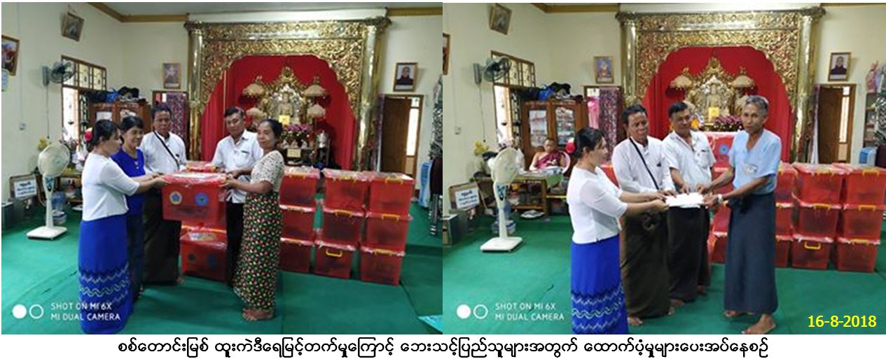 လူမှုဝန်ထမ်း၊ ကယ်ဆယ်ရေးနှင့် ပြန်လည်နေရာချထားရေးဝန်ကြီးဌာန၊ ဘေးအန္တရာယ်ဆိုင်ရာစီမံခန့်ခွဲမှုဦးစီးဌာန၊ ကျိုက်ထိုမြို့နယ်ဦးစီးမှူး ရုံးမှ တာဝန်ရှိသူများသည် ကျိုက်ထိုမြို့နယ်၊ စစ်တောင်းကျေးရွာအုပ်စုတွင် (၁၃-၈-၂၀၁၈)ရက်နေ့နှင့်(၁၄-၈-၂၀၁၈)ဖြစ်ပွား ခဲ့သော စစ်တောင်းမြစ်ထူးကဲ ဒီရေမြင့်တက်မှုကြောင့် ရေဘေးသင့်ခဲ့သော ပြိုလဲနေအိမ် (၁) လုံး၊ အိမ်ထောင်စု (၁)စုအတွက် ကယ်ဆယ်ရေးပစ္စည်း (၁၅)မျိုး (၁) အိမ်ထောင်စာ၊ အိမ်ဆောက်ပစ္စည်းဖိုးငွေ (၁၀၀,၀၀၀/-)ကျပ်နှင့် တစ်စိတ်တစ်ပိုင်းပျက်စီး နေအိမ် (၂၂)လုံးအတွက် ကယ်ဆယ် ရေးပစ္စည်း (၁၁)မျိုး (၂၂) အိမ်ထောင်စာ၊ အိမ်ဆောက်ပစ္စည်း ဖိုးငွေ (၁၀,၅၀၀၀၀/-) ကျပ်နှင့် လူဦးရေ (၁၁၀)ဦးအတွက် ဆန်ရိက္ခာဖိုးငွေ (၇) ရက်စာ (၂၃၁၀၀၀/-)ကျပ်၊ စုစုပေါင်းထောက်ပံ့ငွေ (၁၃၈၁၀၀၀/-)ကျပ်တို့အား (၁၆-၈-၂၀၁၈)ရက်နေ့တွင် စစ်တောင်းကျေးရွာ၊ ရွှေဘုန်းပွင့် ဘုန်းကြီးကျောင်းတွင် ဘေးသင့်ပြည်သူများ လက်ဝယ်အရောက် ထောက်ပံ့ပေးအပ်ခဲ့ကြောင်း သတင်းရရှိပါသည်။