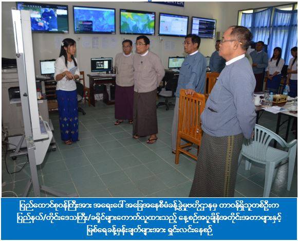 လူမှုဝန်ထမ်း၊ကယ်ဆယ်ရေးနှင့် ပြန်လည်နေရာချထားရေးဝန်ကြီးဌာန၊ ပြည်ထောင်စုဝန်ကြီး၊ ဒေါက်တာဝင်းမြတ်အေးသည် (၂၀၁၆) ခုနှစ်၊ ဧပြီလ (၇) ရက်နေ့၊ နံနက် (၁၁:ဝ၀) နာရီအချိန်တွင် ကယ်ဆယ်ရေးနှင့် ပြန်လည်နေရာချထားရေးဦးစီးဌာနရှိ အရေးပေါ်အခြေအနေစီမံခန့်ခွဲမှုဗဟိုဌာန (EOC) ၏ ဘေးမဖြစ်ပွားမီ ပုံမှန်ချိန်များတွင် မိုးလေဝသအခြေအနေသတင်းများနှင့် အာဆီယံဒေသတွင်း သဘာဝဘေးအန္တရာယ်ဆိုင်ရာ သတင်းအချက်အလက်များကို စောင့်ကြည့်လေ့လာမှုအခြေအနေများ၊ ပြည်သူလူထုထံ သတင်းများ အချိန်နှင့်တစ်ပြေးညီ ရောက်ရှိရေးအတွက် လူမှုကွန်ယက်များဖြစ်သည့် ဝက်ဘ်ဆိုဒ်နှင့် ဖေ့စ်ဘုတ်တို့မှ သတင်းအချက်အလက်ဖြန့်ဝေမှုများကို လာရောက် ကြည့်ရှုလေ့လာခဲ့ပါသည်။ ထို့အပြင် အရေးပေါ်အခြေအနေစီမံခန့်ခွဲမှုဗဟိုဌာနတွင် တပ်ဆင်ထားသည့် Single Side Band – SSB စက်ကိရိယာများသုံးစွဲ၍ တိုင်းဒေသကြီး/ ပြည်နယ်ဦးစီးမှူးရုံးများနှင့် ခရိုင်ဦးစီးမှူးရုံးများသို့ မိုးလေဝသသတင်းအခြေအနေများ ပေးပို့ဆောင်ရွက်မှုကို ပြည်ထောင်စုဝန်ကြီးကိုယ်တိုင် စမ်းသပ်ဆက်သွယ်ခဲ့ပါသည်။ ထို့နောက် ပြည်ထောင်စုဝန်ကြီးမှ အရေးပေါ်အခြေအနေစီမံခန့်ခွဲမှုဗဟိုဌာန ပိုမိုအဆင့်မြှင့်တင်ဆောင်ရွက်နိုင်ရေးနှင့် သက်ဆိုင်ရာတိုင်းဒေသကြီး/ ပြည်နယ်များတွင် SSB စက်များ တိုးချဲ့တပ်ဆင်နိုင်ရေးအတွက် လိုအပ်သည်များကို ဖြည့်ဆည်းဆောင်ရွက်ပေးနိုင်ရန် ဦးစီးဌာနမှ တာဝန်ရှိသူများနှင့် တိုင်ပင်ဆွေးနွေးမှုများ ပြုလုပ်ခဲ့ကြောင်း သိရှိရပါသည်။