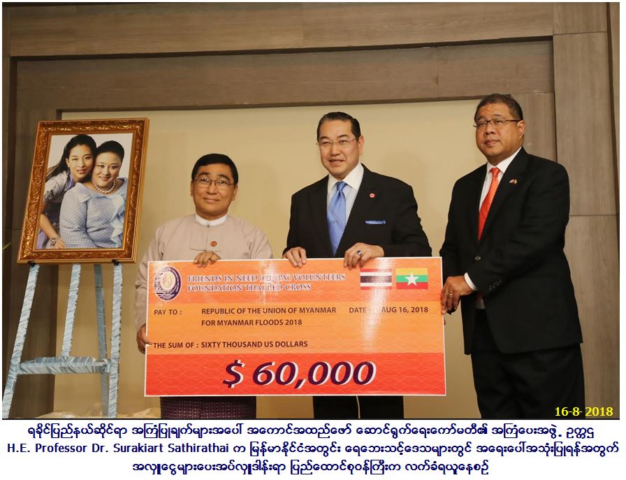 ဆက်လက်၍ ထိုင်းနိုင်ငံ Friends in Need (of “Pa”) Volunteers Foundation, Thai Red Cross မှ မြန်မာနိုင်ငံအတွင်း ရေဘေးသင့် ဒေသများတွင် အရေးပေါ်အသုံးပြုရန်အတွက် ထိုင်းဘတ်ငွေ (၂) သန်းနှင့်ညီမျှသော အမေရိကန်ဒေါ်လာ (၆) သောင်းကို ရခိုင်ပြည်နယ် ဆိုင်ရာ အကြံပြုချက်များအပေါ် အကောင်အထည်ဖော် ဆောင်ရွက်ရေးကော်မတီ၏ အကြံပေးအဖွဲ့ ဥက္ကဌ H.E. Professor Dr. Surakiart Sathirathai က ပေးအပ်လှူဒါန်းရာ လူမှုဝန်ထမ်း၊ ကယ်ဆယ်ရေးနှင့် ပြန်လည်နေရာချထားရေးဝန်ကြီးဌာန ပြည်ထောင်စုဝန်ကြီးက လက်ခံရ ယူခဲ့ပါသည်။