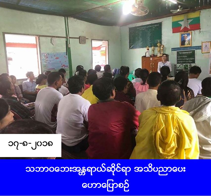 လူမှုဝန်ထမ်း၊ ကယ်ဆယ်ရေးနှင့် ပြန်လည်နေရာချထားရေးဝန်ကြီးဌာန၊ ဘေးအန္တရာယ်ဆိုင်ရာစီမံခန့်ခွဲမှုဦးစီးဌာန၊ မွန်ပြည်နယ်ဦးစီးမှူးရုံးမှ တာဝန်ရှိသူများသည် (၁၇-၈-၂၀၁၈) ရက်နေ့၊ (၁၀း၀၀) နာရီမှ (၁၁း၃၀) နာရီထိ မော်လမြိုင်မြို့၊ သီရိမင်္ဂလာရပ်ကွက်ရှိ ရပ်ကွက်အုပ်ချုပ်ရေးမှူးရုံး၌ သဘာဝဘေးအန္တရာယ်ဆိုင်ရာ ကြိုပြင်ဆင်ခြင်း၊ ကြိုတင်ကာကွယ်ခြင်းဆိုင်ရာ ဆောင်ရန်/ရှောင်ရန်များကို အသိပညာပေး ဟောပြောဆွေးနွေးခြင်းနှင့် လက်ကမ်းစာစောင်များ ဖြန့်ဝေခြင်းများ ဆောင်ရွက်ခဲ့ကြောင်း သိရှိရပါသည်။