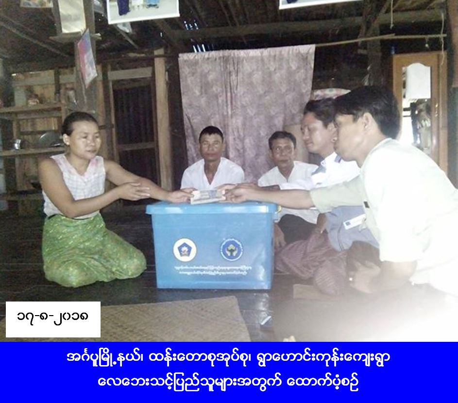 လူမှုဝန်ထမ်း၊ ကယ်ဆယ်ရေးနှင့် ပြန်လည်နေရာချထားရေးဝန်ကြီးဌာန၊ ဘေးအန္တရာယ်ဆိုင်ရာစီမံခန့်ခွဲမှုဦးစီးဌာန၊ ဟင်္သာတခရိုင်ဦးစီးမှူးရုံးမှ တာဝန်ရှိသူများသည် အင်္ဂပူမြို့နယ်၊ ထန်းတောစုအုပ်စု၊ ရွာဟောင်းကုန်းကျေးရွာ၌ (၁၆-၈-၂၀၁၈) ရက်နေ့တွင် ဖြစ်ပွားခဲ့သော လေဘေးကြောင့် တစ်စိတ်တစ်ပိုင်းပျက်စီးခဲ့သည့် (ဝါးအိမ်) အိမ်ခြေ(၁)လုံး၊ ၎င်းအိမ်ထောင်စု (၁)စုရှိ လူဦးရေ (၃) ဦးတို့အတွက် ကယ်ဆယ်ရေးပစ္စည်း (၁၀)မျိုး၊ (၁)အိမ်ထောင်စာ၊ အိမ်ဆောက်ပစ္စည်းဖိုး (၅၀၀၀၀) ကျပ်၊ ဆန်ရိက္ခာဖိုး (၆၃၀၀) ကျပ်၊ စုစုပေါင်းကယ်ဆယ်ရေးရန်ပုံငွေ (၅၆၃၀၀) ကျပ်ကို (၁၇-၈ -၂၀၁၈) ရက်နေ့တွင် အင်္ဂပူမြို့နယ်၊ အထွေထွေအုပ်ချုပ်ရေးဦးစီးဌာနမှ တာဝန်ရှိသူများနှင့်အတူ ဘေးဖြစ်ပွားသည့်နေရာသို့ သွားရောက်ကာ ဘေးသင့်ပြည်သူများလက်ဝယ်သို့ ထောက်ပံ့ပေးအပ်ခဲ့ကြောင်း သိရှိရပါသည်။