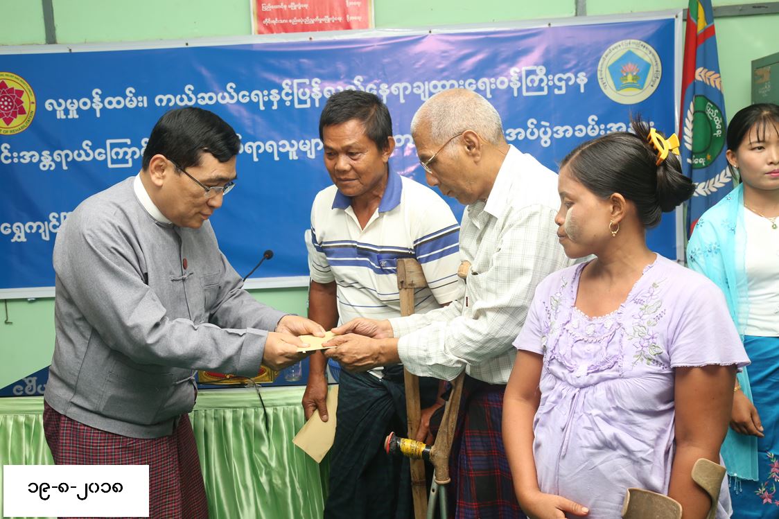 လူမှုဝန်ထမ်း၊ ကယ်ဆယ်ရေးနှင့် ပြန်လည်နေရာချထာရေးဝန်ကြီးဌာန၊ ပြည်ထောင်စုဝန်ကြီး ဒေါက်တာဝင်းမြတ်အေးသည် ယနေ့နံနက်ပိုင်းက ပဲခူးတိုင်းဒေသကြီး၊ အုတ်တွင်းမြို့၊ ကျောက်ကြီးမြို့များသို့ရောက်ရှိပြီး မသန်စွမ်းသူများကို အားပေးထောက်ပံ့ခြင်း အခမ်းအနား များသို့တက်ရောက်၍ အမှာစကားပြောကြားရာတွင် မိမိတို့ဝန်ကြီးဌာနသည် နိုင်ငံတော်၏ ဘဏ္ဍာငွေရရှိမှုပေါ်မူတည်၍ ပြည်သူများတိုက်ရိုက်အကျိုးရှိစေမည့် လူမှုကာကွယ် စောင့်ရှောက်မှုလုပ်ငန်းများကို ဆောင်ရွက်လျက်ရှိပါကြောင်း၊ မသန်စွမ်းသူများကိုလည်း ၎င်းတို့ရရှိမည့်အခွင့်အရေး အပြည့်အဝရရှိရေး၊ စွမ်းဆောင်ရည် မြင့်မားရေး၊ ပါဝင်ဆောင်ရွက် နိုင်ရေး၊ အလုပ်အကိုင်ရရှိရေးများကို ဆောင်ရွက်ပေးလျက်ရှိပါကြောင်း၊ မသန်စွမ်းသူများကို မသန်စွမ်းအဆင့်သတ်မှတ်ထားရှိပြီး ပုံမှန်ထောက်ပံ့မှုများပြုနိုင် အောင်လည်း ကြိုးပမ်းလျက် ရှိပါကြောင်း၊ မသန်သော်လည်းစွမ်းကြသူများဖြစ်စေရန် အစိုးရ၊ ပြည်သူများ၊ လူမှုအဖွဲ့အစည်း များ အားလုံးပူးပေါင်းပါဝင် ဆောင်ရွက်ကြရန်လည်း တိုက်တွန်းပါကြောင်းဖြင့်ပြောကြားပြီး၊ အုတ်တွင်းမြို့နယ်ရှိ မသန်စွမ်းသူများအတွက် ကျပ်(၂၀၈.၈)သိန်း၊ ကျောက်ကြီးမြို့နယ်ရှိ မိုင်းဒဏ်ရာကြောင့် မသန်စွမ်းဖြစ်သူများအတွက် ကျပ်(၅၀)သိန်းတို့ကို ထောက်ပံ့ပေးအပ်ရာ တာဝန်ရှိသူများက လက်ခံရယူပြီး ကျေးဇူးတင်စကားပြန်လည်ပြောကြားခဲ့ပါသည်။