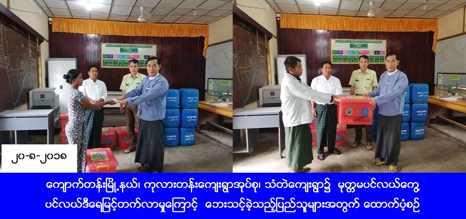 လူမှုဝန်ထမ်း၊ ကယ်ဆယ်ရေးနှင့် ပြန်လည်နေရာချထားရေးဝန်ကြီးဌာန၊ ဘေးအန္တရာယ်ဆိုင်ရာစီမံခန့်ခွဲမှုဦးစီးဌာန၊ ရန်ကုန်တိုင်းဒေသကြီးဦးစီးမှူးရုံးမှ တာဝန်ရှိသူများသည် ကျောက်တန်းမြို့နယ်၊ ကုလားတန်းကျေးရွာအုပ်စု၊ သံတဲကျေးရွာ၌ (၁၅-၈-၂၀၁၈) ရက်နေ့တွင် မုတ္တမပင်လယ်ကွေ့ ပင်လယ်ဒီရေမြင့်တက်လာမှုကြောင့် ပြိုကျပျက်စီးခဲ့သည့် နေအိမ် (၃) လုံးနှင့် တစ်စိတ်တစ်ပိုင်းပျက်စီးခဲ့သည့် နေအိမ် (၇) လုံးအတွက် အိမ်ဆောက်ပစ္စည်းဖိုး (၁၀၀၀၀၀၀ိ/-)၊ အိမ်ထောင်စု (၁၀) စုမှ ဘေးသင့်လူဦးရေ (၃၉) ဦးအတွက် ဆန်ရိက္ခာ (၇) ရက်စာဖိုး (၈၁၉၀၀ိ/-)နှင့် ကယ်ဆယ်ရေးပစ္စည်း(၁၁)မျိုး (၁၀)အိမ်ထောင်စုစာအား (၂၀-၈-၂၀၁၈) ရက်နေ့တွင် ဘေးသင့်ပြည်သူများထံသို့ သွားရောက်ထောက်ပံ့ပေးခဲ့ကြောင်း သိရှိရပါသည်။