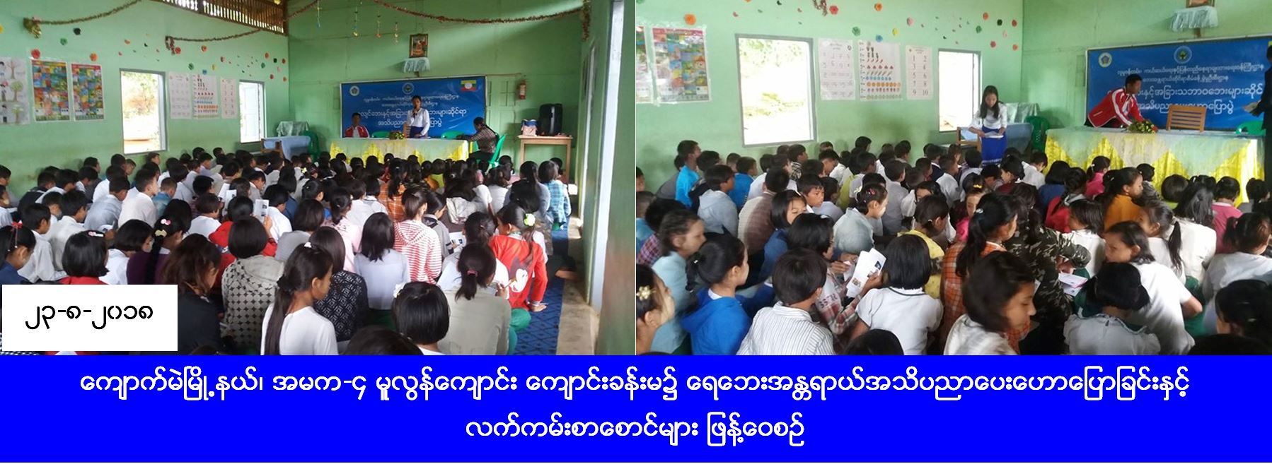 လူမှုဝန်ထမ်း၊ ကယ်ဆယ်ရေးနှင့် ပြန်လည်နေရာချထားရေးဝန်ကြီးဌာန၊ ဘေးအန္တရာယ်ဆိုင်ရာစီမံခန့်ခွဲမှုဦးစီးဌာန၊ ကျောက်မဲခရိုင်ဦးစီးမှူးရုံးမှ တာဝန်ရှိသူများသည် (၂၃-၈-၂၀၁၈) ရက်နေ့၊ နေ့လည် (၁၃း၀၀) နာရီအချိန်တွင် ကျောက်မဲမြို့နယ်၊ အမက-၄ မူလွန်ကျောင်း ကျောင်းခန်းမ၌ ကျောင်းသား/သူ (၁၇၀) ဦးခန့်အား ရေဘေးအန္တရာယ်အသိပညာပေးခြင်းနှင့် လက်ကမ်းစာစောင်များ ဖြန့်ဝေပေးခြင်းများ ဆောင်ရွက်ခဲ့ကြောင်း သိရှိရပါသည်။