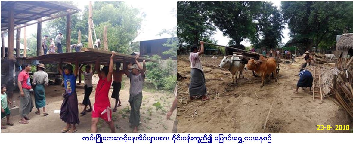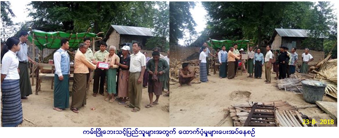 လူမှုဝန်ထမ်း၊ ကယ်ဆယ်ရေးနှင့် ပြန်လည်နေရာချထားရေးဝန်ကြီးဌာန၊ ဘေးအန္တရာယ်ဆိုင်ရာစီမံခန့်ခွဲမှုဦးစီးဌာန၊ ပခုက္ကူခရိုင်ဦးစီးမှူးရုံးမှ တာဝန်ရှိသူများသည် ပေါက်မြို့နယ်၊ ညောင်ဝန်းကျေးရွာအုပ်စု၊ ညောင်ဝန်း(မ)ကျေးရွာတွင် (၂၂-၈-၂၀၁၈) ရက်နေ့တွင် ဖြစ်ပွားခဲ့သော ယောချောင်းရေတိုက်စား ကမ်းပြိုဘေးကြောင့် ပြောင်းရွှေ့အိမ်ခြေ(၄)လုံး၊ အိမ်ထောင်စု(၄)စု၊ လူဦးရေ(၁၆)ဦးအတွက် ကယ်ဆယ်ရေးပစ္စည်း (၉) မျိုး၊ အိမ်ဆောက်ပစ္စည်းဖိုး (၄၀၀၀၀၀/-)ကျပ်၊ ဆန်ရိက္ခာဖိုး (၃၃၆၀၀/-)ကျပ်၊ စုစုပေါင်း (၄၃၃၆၀၀/-)ကျပ်တို့အား (၂၃-၈-၂၀၁၈)ရက်နေ့တွင် အမှတ်(၁)တိုင်းဒေသကြီးလွှတ်တော်ကိုယ်စားလှယ်၊ ဦးအောင်သန်း၊ ပေါက်မြို့နယ်အထွေထွေအုပ်ချုပ်ရေးဦးစီးဌာန၊ မြို့နယ်အုပ်ချုပ်ရေးမှူး၊ ဌာနဆိုင်ရာများနှင့်အတူ ညောင်ဝန်း(မ)ကျေးရွာ၌ ဘေးသင့်ပြည်သူများ၏ လက်ဝယ်အရောက် ထောက်ပံ့ပေးအပ်ခဲ့ကြောင်း သတင်းရရှိပါ သည်။