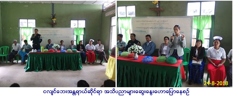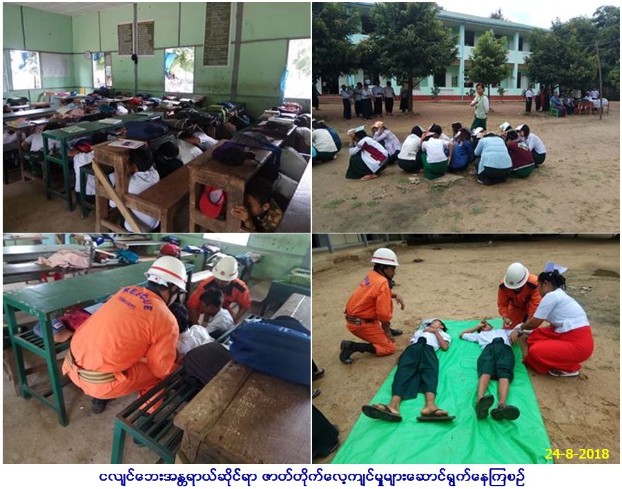 လူမှုဝန်ထမ်း၊ ကယ်ဆယ်ရေးနှင့် ပြန်လည်နေရာချထားရေးဝန်ကြီးဌာန၊ ဘေးအန္တရာယ်ဆိုင်ရာစီမံခန့်ခွဲမှုဦးစီးဌာန၊ ပြည်ထောင်စုနယ်မြေ၊ နေပြည်တော်တိုင်းဦးစီးမှူးရုံးမှ တာဝန်ရှိသူများသည် (၂၄-၈-၂၀၁၈)ရက်နေ့တွင် (၁၀း၀၀)မှ (၁၂း၀၀)နာရီအချိန်ထိ ပျဉ်မနားမြို့နယ် သစ်လေးလုံး အ.ထ.က စာသင်ကျောင်းတွင် ကျောင်းသား/ကျောင်းသူ (၂၅၀)ဦး၊ ပျဉ်းမနားမြို့နယ် သဘာဝဘေးစီမံခန့်ခွဲမှုအဖွဲ့ဝင်များနှင့် ပူးပေါင်း၍ ငလျင်ဘေးအန္တရာယ်ဆိုင်ရာ အသိပညာများဆွေးနွေးဟာပြောခြင်းနှင့် သဏ္ဌာန်တူဇာတ်တိုက်လေ့ကျင့်မှုများဆောင်ရွက်ခဲ့ပြီး လက် ကမ်းစာစောင်များဖြန့်ဝေပေးခဲ့ကြောင်း သတင်းရရှိပါသည်။