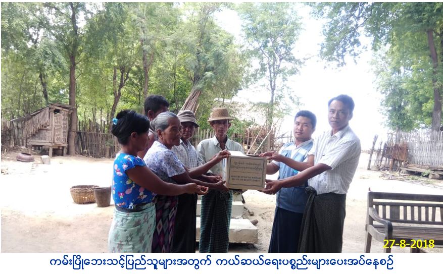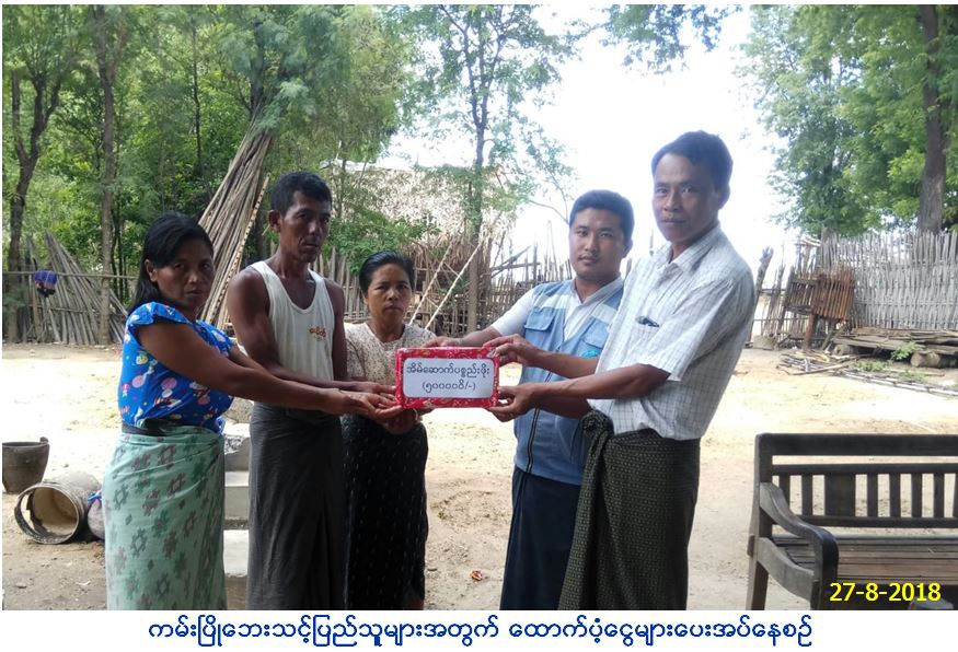 လူမှုဝန်ထမ်း၊ ကယ်ဆယ်ရေးနှင့် ပြန်လည်နေရာချထားရေးဝန်ကြီးဌာန၊ ဘေးအန္တရာယ်ဆိုင်ရာစီမံခန့်ခွဲမှုဦးစီးဌာန၊ ပခုက္ကူခရိုင်ဦးစီးမှူးရုံးမှ တာဝန်ရှိသူများသည် ပေါက်မြို့နယ်၊ ညောင်ဝန်းကျေးရွာအုပ်စု၊ ညောင်ဝန်းကျေးရွာ(မ)တွင် (၂၄/၂၅-၈-၂၀၁၈) ရက်နေ့တွင် ဖြစ်ပွားခဲ့သော ကမ်းပြိုဘေးကြောင့် ကြိုတင်ပြောင်းရွှေ့လူနေအိမ်(၅)လုံး၊ အိမ်ထောင်စု(၅)စု၊ လူဦးရေ(၂၃)ဦး ဘေးသင့်ခဲ့ရာ အိမ်ဆောက်ပစ္စည်းဖိုး (၅၀၀၀၀၀/-)ကျပ်၊ ဆန်ရိက္ခာဖိုး (၄၈၃၀၀/-)ကျပ်၊ ကယ်ဆယ်ရေးပစ္စည်း(၉)မျိုး၊ စုစုပေါင်း (၅၄၈၃၀၀/) (ကျပ်ငါးသိန်းလေးသောင်း ရှစ်ထောင့်သုံးရာတိတိ)တို့အား (၂၇-၈-၂၀၁၈)ရက်နေ့တွင် ပေါက်မြို့နယ်အထွေထွေအုပ်ချုပ်ရေးဦးစီးဌာနမှ တာဝန်ရှိသူများ၊ ကျေးရွာမှ တာဝန်ရှိသူများနှင့်အတူ ဘေးသင့်ပြည်သူများ၏ လက်ဝယ်အရောက် ထောက်ပံ့ပေးအပ်ခဲ့ကြောင်း သတင်းရရှိပါသည်။