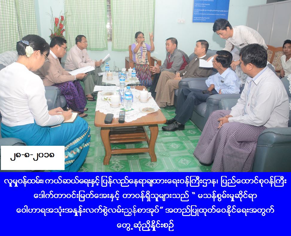 မြန်မာနိုင်ငံမသန်စွမ်းသူများအသင်းချုပ်ကဦးဆောင်၍ မြန်မာနိုင်ငံ နားမကြားသူများ ဖွံ့ဖြိုး တိုးတက်ရေးအဖွဲ့နှင့် မသန်စွမ်းအဖွဲ့အစည်းများ၏ ပူးပေါင်းပါဝင်မှုဖြင့်ပြုစုထားသော “ မသန်စွမ်း မှုဆိုင်ရာ ဝေါဟာရအသုံးအနှုန်းလက်စွဲလမ်းညွှန်စာအုပ်” အတည်ပြုထုတ်ဝေနိုင်ရေးအတွက် တွေ့ဆုံညှိနှိုင်းခြင်းကို ရန်ကုန်မြို့ လူမှုဝန်ထမ်းဦးစီးရုံးတွင် ယနေ့နံနက်ပိုင်းက ကျင်းပပြုလုပ်ခဲ့ရာ လူမှုဝန်ထမ်း၊ ကယ်ဆယ်ရေးနှင့် ပြန်လည်နေရာချထားရေးဝန်ကြီးဌာန၊ ပြည်ထောင်စုဝန်ကြီး ဒေါက်တာဝင်းမြတ်အေးနှင့် တာဝန်ရှိသူများ တက်ရောက်ခဲ့ကြပါသည်။