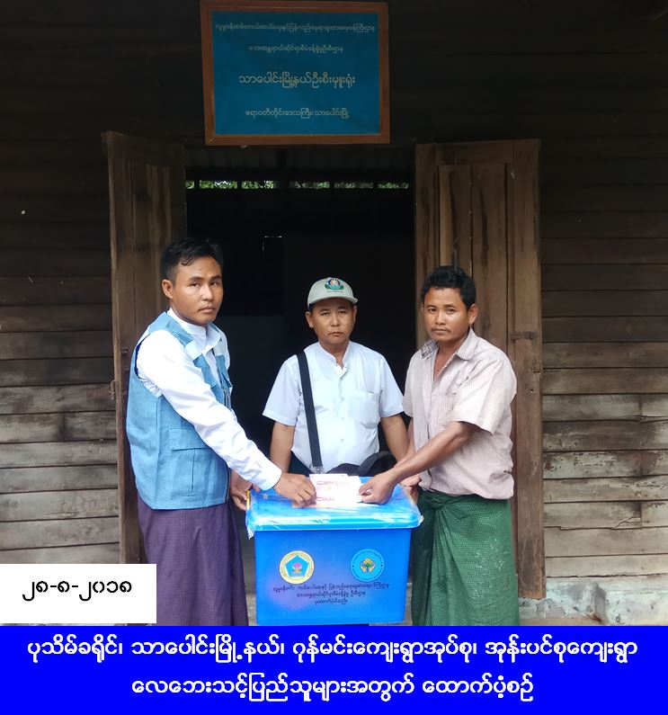 လူမှုဝန်ထမ်း၊ ကယ်ဆယ်ရေးနှင့် ပြန်လည်နေရာချထားရေးဝန်ကြီးဌာန၊ ဘေးအန္တရာယ်ဆိုင်ရာစီမံခန့်ခွဲမှုဦးစီးဌာန၊ သာပေါင်းမြို့နယ်ဦးစီးမှူးရုံးမှ တာဝန်ရှိသူများသည် ပုသိမ်ခရိုင်၊ သာပေါင်းမြို့နယ်၊ ဂုန်မင်းကျေးရွာအုပ်စု၊ အုန်းပင်စုကျေးရွာ၌ (၂၆-၈-၂၀၁၈) ရက်နေ့တွင် ဖြစ်ပွားခဲ့သော လေဘေးကြောင့် အမိုးလန်ပျက်စီးခဲ့သည့် နေအိမ်(၁)လုံး၊ အိမ်ထောင်စု (၁) စုမှ လူဦးရေ (၈) ဦးအတွက် ဆန်ရိက္ခာ(၇)ရက်စာ ရန်ပုံငွေ (၁၆၈၀၀ိ/-)၊ ကယ်ဆယ်ရေးပစ္စည်း (၁၀)မျိုး (၁) အိမ်ထောင်စာ၊ အိမ်ဆောက်ပစ္စည်းဖိုး (၅၀၀၀၀ိ/-)၊ စုစုပေါင်း ထောက်ပံ့ရန်ပုံငွေ (၆၆၈၀၀ိ/-)အား (၂၈-၈-၂၀၁၈) ရက်နေ့ (၁၄း၀၀) နာရီအချိန်တွင် ဘေးသင့်ပြည်သူများ လက်ဝယ်အရောက် ထောက်ပံ့ပေးအပ်ခဲ့ပါကြောင်း သိရှိရပါသည်။