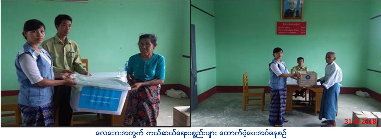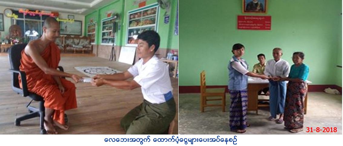 လူမှုဝန်ထမ်း၊ ကယ်ဆယ်ရေးနှင့် ပြန်လည်နေရာချထားရေးဝန်ကြီးဌာန၊ ဘေးအန္တရာယ်ဆိုင်ရာစီမံခန့်ခွဲမှုဦးစီးဌာန၊ မြိတ်ခရိုင်ဦးစီးမှူးရုံးမှ တာဝန်ရှိသူ များသည် (၃၀.၈.၂၀၁၈)ရက်နေ့ မြိတ်ခရိုင်၊ ပုလောမြို့နယ်၊ ပလမြို့ အမှတ်(၁)ရပ်ကွက်နှင့် ပိတပ်ကျေးရွာလေဘေးတွင် လေဘေးသင့်ခဲ့ သော အိမ်ခြေ(၆)လုံး၊ အိမ်ထောင်စုမှ လူဦးရေ(၄၁)ဦးအတွက် ဆန်ဖိုး (၈၆၁၀၀/-)ကျပ်၊ ပြိုလဲအိမ်နှင့် အမိုးလန်အိမ်လုံးအတွက် အိမ်ဆောက်ပစ္စည်းဖိုး (၃၆၀၀၀၀/-)ကျပ်၊ ကယ်ဆယ်ရေးပစ္စည်း (၁၅)မျိုး(၁)စုနှင့် (၁၀)မျိုး (၅)စုစာ၊ အမိုးလန်ဘုန်းကြီးကျောင်းတွက် ထောက်ပံ့ငွေ (၉၈၀၀၀/-)ကျပ်တို့အား (၃၁.၈.၂၀၁၈)ရက်နေ့၊ (၁၅း၀၀)နာရီအချိန်တွင် ထောက်ပံ့ခဲ့ကြောင်း သတင်းရရှိပါသည်။