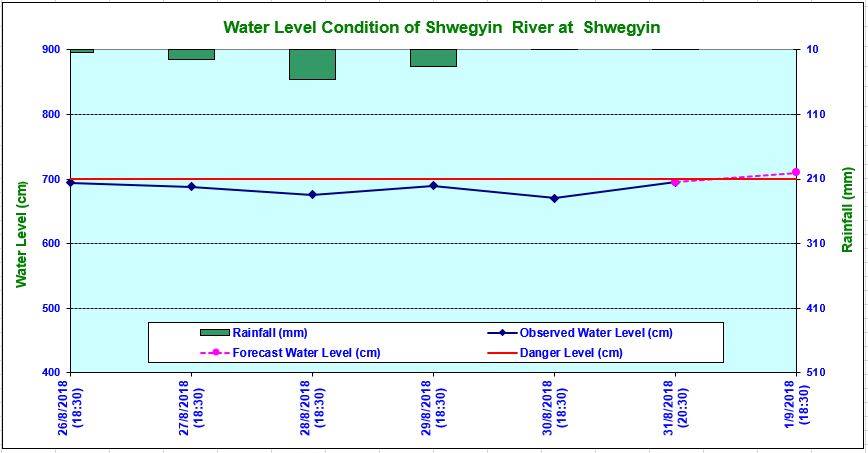၂၀၁၈ ခုနှစ်၊ သြဂုတ်လ (၃၁)ရက်နေ့၊ မြန်မာစံတော်ချိန် (၂၁:၀၀) နာရီအချိန်တွင် မိုးလေဝသနှင့်ဇလဗေဒညွန်ကြားမှုဦးစီးဌာန မှမြစ်ရေကြီးခြင်းသတိပေးချက်ကို အောက်ပါအတိုင်း ထုတ်ပြန်ထားပါသည်။