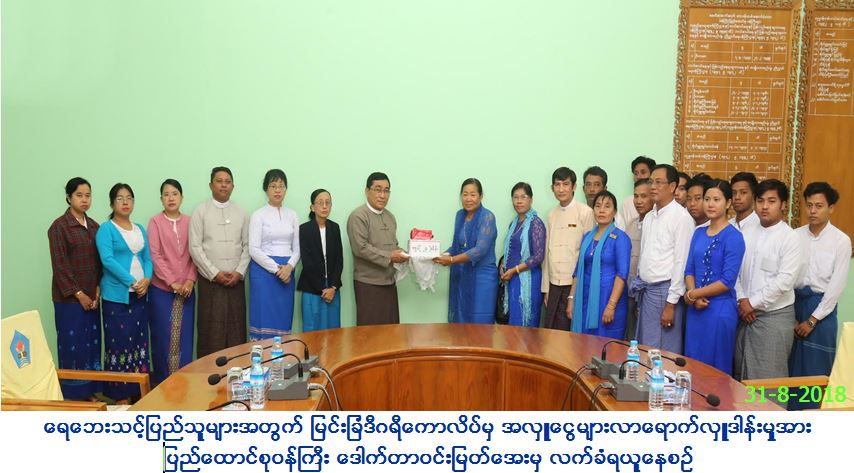 ဆက်လက်၍ မြင်းခြံဒီဂရီကောလိပ်၊ ပါမောက္ခဌာနမှူး၊ ဒေါက်တာကြည်ကြည်သိန်း ဦးဆောင်သော ဆရာ/ဆရာမများ၊ ကျောင်းသား/ ကျောင်းသူ များသည် နေပြည်တော်ရှိ လူမှုဝန်ထမ်း၊ ကယ်ဆယ်ရေးနှင့် ပြန်လည်နေရာချထားရေးဝန်ကြီးဌာန၊ ဝန်ကြီးရုံး၊ အစည်းအဝေးခန်းမတွင် ရေဘေးသင့်ပြည် သူများအတွက် အလှူငွေကျပ် (၂၃၀၀,၀၀၀ိ/-) (ကျပ်နှစ်ဆယ့်သုံးသိန်းတိတိ)ကို နံနက်(၁၀း၃၀)နာရီတွင် လာရောက်ပေးအပ်လှူဒါန်းရာ ပြည်ထောင်စု ဝန်ကြီး ဒေါက်တာဝင်းမြတ်အေးက လက်ခံရယူပြီး ကျေးဇူးတင်စကားပြောကြားကာ ဂုဏ်ပြုမှတ်တမ်းလွှာ ပြန်လည်ပေးအပ်ခဲ့ကြောင်း သတင်းရရှိပါ သည်။