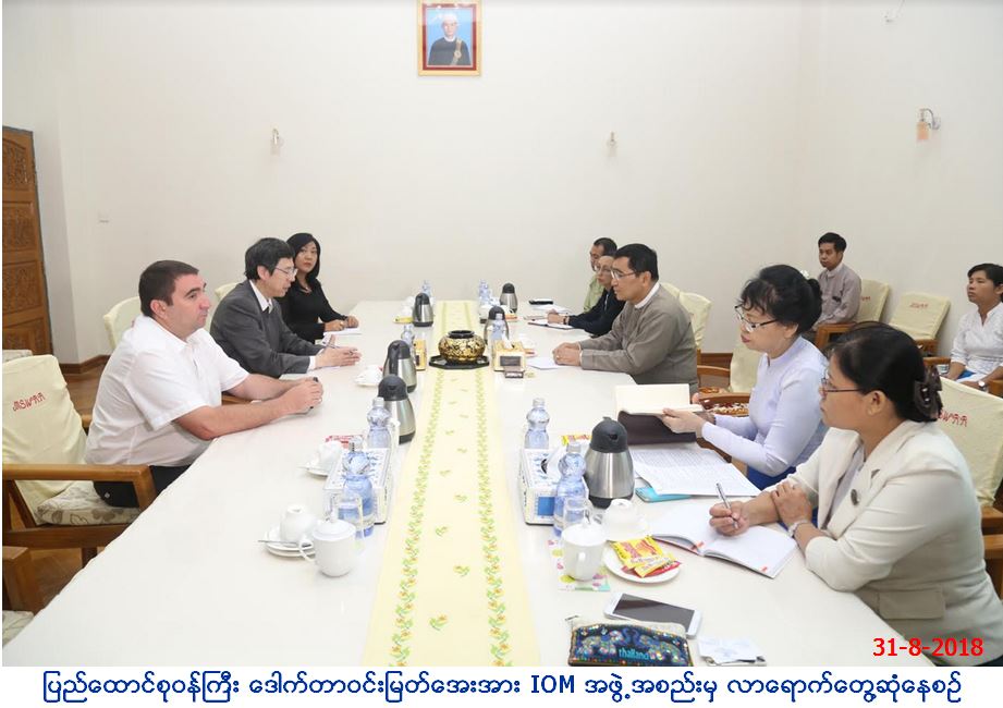လူမှုဝန်ထမ်း၊ ကယ်ဆယ်ရေးနှင့် ပြန်လည်နေရာချထားရေးဝန်ကြီးဌာန၊ ပြည်ထောင်စုဝန်ကြီး ဒေါက်တာဝင်းမြတ်အေးအား ရွှေ့ပြောင်းသွား လာနေထိုင်ခြင်းဆိုင်ရာ နိုင်ငံတကာအဖွဲ့အစည်း (IOM) မှ Chief of Mission ဖြစ်သူ Mr. Akio Nakayama ဦးဆောင်သောအဖွဲ့တို့က ယနေ့ နံနက်ပိုင်းတွင် နေပြည်တော်ရှိ အဆိုပါဝန်ကြီးရုံး၊ မေခလာခန်းမ၌ လာရောက်တွေ့ဆုံခဲ့ပါသည်။