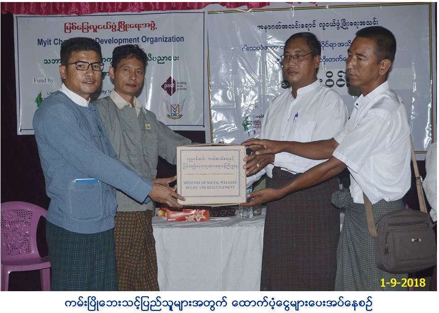 လူမှုဝန်ထမ်း၊ ကယ်ဆယ်ရေးနှင့် ပြန်လည်နေရာချထားရေးဝန်ကြီးဌာန၊ ဘေးအန္တရာယ်ဆိုင်ရာစီမံခန့်ခွဲမှုဦးစီးဌာန၊ ပခုက္ကူခရိုင်ဦးစီးမှူးရုံးမှ တာဝန်ရှိသူများသည် (၃၁-၈-၂၀၁၈)ရက်နေ့တွင် ကမ်းပြိုဘေးဖြစ်ပေါ်ခဲ့သည့် ပခုက္ကူမြို့နယ်၊ ဆိက္ခဝကျေးရွာအုပ်စု၊ အနောက်သီရိကျေးရွာ တွင် လူနေအိမ်(၁၃)လုံး ပြောင်းရွှေ့ခဲ့ရသဖြင့် ဘေးသင့်အိမ်ခြေ(၁၃)လုံး၊ အိမ်ထောင်စု(၁၃)စု၊ ဘေးသင့်လူဦးရေ(၅၁)ဦးတို့အား အိမ်ဆောက်ပစ္စည်းဖိုး (၁၃၀၀၀၀၀/-)ကျပ်၊ ဆန်ရိက္ခာဖိုး (၁၀၇၁၀၀/-)ကျပ်၊ ကယ်ဆယ်ရေးပစ္စည်း(၉)မျိုး၊ စုစုပေါင်း (၁၄၀၇၁၀၀/-)(ကျပ်တစ်ဆယ့်လေးသိန်းခုနှစ်ထောင့်တစ်ရာတိတိ)အား (၁-၉-၂၀၁၈)ရက်နေ့တွင် မြို့နယ်အထွေထွေအုပ်ချုပ်ရေးဦးစီးဌာနမှ ဒုတိယမြို့နယ် အုပ်ချုပ်ရေးမှူး ဦးတင်ထူးအောင်၊ ခရိုင်ပြန်/ဆက်ဦးစီးမှူး ဦးဇော်ဌေးအောင်၊ အနာဂတ်အလင်းရောင်လူငယ်ဖွံ့ဖြိုးရေးအသင်း ဥက္ကဌ ဦးရဲထွဋ်၊ ဌာနဆိုင်ရာများနှင့်အတူ ဘေးသင့်ပြည်သူများ၏ လက်ဝယ်အရောက်ထောက်ပံ့ပေးအပ်ခဲ့ကြောင်း သတင်းရရှိပါသည်။