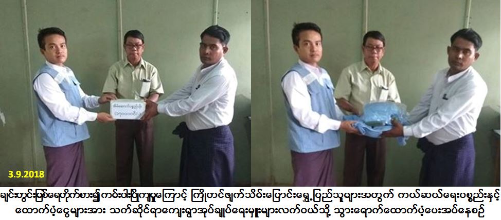 အဆိုပါကြိုတင်ဖျက်သိမ်းပြောင်းရွှေ့ပြည်သူများအတွက် ကယ်ဆယ်ရေးပစ္စည်း (၉) မျိုး၊ ဆန်ရိက္ခာဖိုး (၇) ရက်စာ (၁၉၁,၁၀၀/-) ကျပ်နှင့် အိမ်ဆောက်ပစ္စည်းဖိုးထောက်ပံ့ငွေ (၁,၇၀၀,၀၀၀/- ) ကျပ်၊ စုစုပေါင်း ထောက်ပံ့ငွေ (၁,၈၉၁,၁၀၀/-) ကျပ်အား (၃-၉-၂၀၁၈) ရက်နေ့တွင် ရေစကြိုမြို့နယ်အထွေထွေအုပ်ချုပ်ရေးဦးစီးဌာနရုံး၌ မြို့နယ်အထွေထွေအုပ်ချုပ်ရေးရုံးမှ တာဝန်ရှိသူများနှင့်အတူ သက်ဆိုင်ရာကျေးရွာအုပ်ချုပ်ရေးမှူးများ လက်ဝယ်သို့ သွားရောက်ထောက်ပံ့ပေးအပ်ခဲ့ကြောင်းသတင်းရရှိပါသည်။
