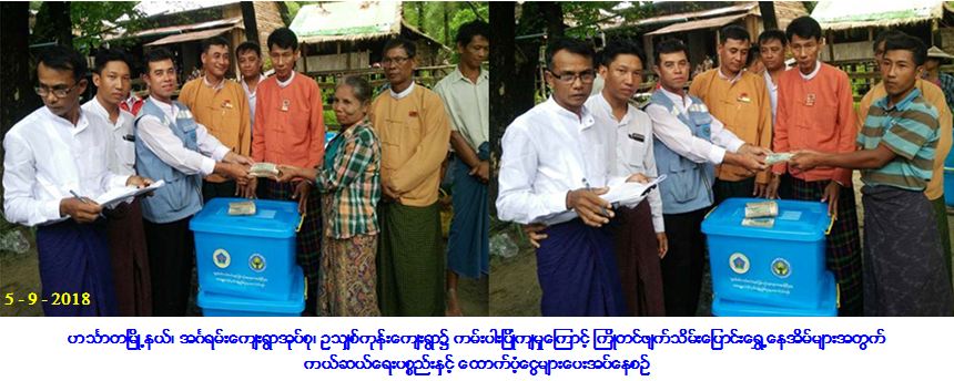 လူမှုဝန်ထမ်း၊ ကယ်ဆယ်ရေးနှင့် ပြန်လည်နေရာချထားရေးဝန်ကြီးဌာန၊ ဘေးအန္တရာယ်ဆိုင်ရာစီမံခန့်ခွဲမှုဦးစီးဌာန၊ ဟင်္သာတခရိုင်ဦးစီးမှူးရုံးမှတာဝန်ရှိသူများသည် ဟင်္သာတမြို့နယ်၊ အင်္ဂရမ်းကျေးရွာအုပ်စု၊ ဥသျှစ်ကုန်းကျေးရွာ၌ (၄-၉-၂၀၁၈) နေ့တွင် ကမ်းပြိုဘေးကြောင့် ကြိုတင်ဖျက်သိမ်းပြောင်းရွှေ့ရသော အိမ်ခြေ (၁၀) လုံး၊ အိမ်ထောင်စု (၁၀) စုရှိ လူဦးရေ (၄၁) ဦးနှင့် ဘုန်းတော်ကြီးကျောင်း (၁) ကျောင်းတို့အတွက် (၁၈၅,၁၀၀/-) ကျပ်တန်ဖိုးရှိသော ကယ်ဆယ်ရေးပစ္စည်း (၁၀) မျိုး၊ (၁၀) အိမ်ထောင်စာ၊ အိမ်ဆောက်ပစ္စည်းဖိုးငွေ (၁,၀၀၀,၀၀၀/-) ကျပ်၊ ဆန်ရိက္ခာဖိုး ငွေ (၈၆,၁၀၀/-) ကျပ်၊ ဘုန်းကြီးကျောင်းအတွက် ထောက်ပံ့ငွေ (၁၀၀,၀၀၀/-) ကျပ်၊ စုစုပေါင်းကယ်ဆယ်ရေးရန်ပုံငွေ (၁,၁၈၆,၁၀၀/-) ကျပ်တို့အား ( ၅-၉ -၂၀၁၈) ရက်နေ့တွင် လွှတ်တော်ကိုယ်စားလှယ်များ၊ ဟင်္သာတမြို့နယ်၊ အထွေထွေအုပ်ချုပ်ရေးဦးစီးဌာနမှ တာဝန်ရှိသူများနှင့်အတူ ဘေးသင့်ပြည်သူများလက်ဝယ်သို့ ထောက်ပံ့ပေးအပ်ခဲ့ကြောင်း သတင်းရရှိပါသည်။