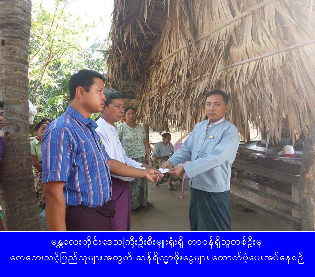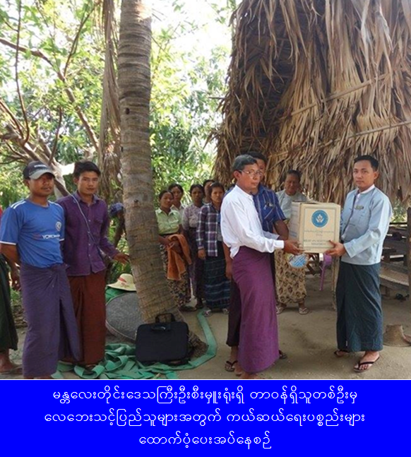 ၂။ အဆိုပါဘေးအတွက် လူမှုဝန်ထမ်း၊ ကယ်ဆယ်ရေးနှင့် ပြန်လည်နေရာချထားရေးဝန်ကြီးဌာန၊ ကယ်ဆယ်ရေးနှင့် ပြန်လည်နေရာချထားရေးဦးစီးဌာန၊ မန္တလေးတိုင်းဒေသကြီးဦးစီးမှူးရုံးမှ ဆန်ရိက္ခာဖိုးငွေကျပ် (၅၄၀၀၀/-)၊ ကယ်ဆယ်ရေး ပစ္စည်း (၄) မျိုးကို (၁၄) အိမ်ထောင်စာအတွက် (၉-၄-၂၀၁၆) ရက်နေ့တွင် ဘေးသင့်ပြည်သူများထံသို့ ထောက်ပံ့ပေးခဲ့ကြောင်း သိရှိရပါသည်။