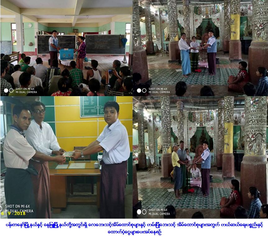 (၁၁) ဓနုဖြူမြို့နယ်၊ အမှတ် (၁၆) ရပ်ကွက်၌ (၂၃ – ၈ – ၂၀၁၈) ရက်နေ့တွင် ဖြစ်ပွားခဲ့သည့် လေဘေးကြောင့် ပြိုကျပျက်စီး နေအိမ် (၁) လုံး အိမ်ထောင်စု (၁) စုအတွက် ကယ်ဆယ်ရေးပစ္စည်း (၁၆) မျိုး၊ အိမ်ဆောက်ပစ္စည်းဖိုးငွေ (၁၀၀,၀၀၀/-) ကျပ်နှင့် လူဦးရေ (၃) ဦးအတွက် ဆန်ရိက္ခာဖိုးရန်ပုံငွေ (၆,၃၀၀/-) ကျပ် စုစုပေါင်းကယ်ဆယ်ရေးရန်ပုံငွေ (၁၀၆,၃၀၀/-) ကျပ်တို့အားလည်းကောင်း အသီးသီးထောက်ပံ့ပေးအပ်ခဲ့ကြောင်း သတင်းရရှိပါသည်။