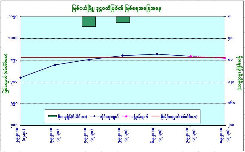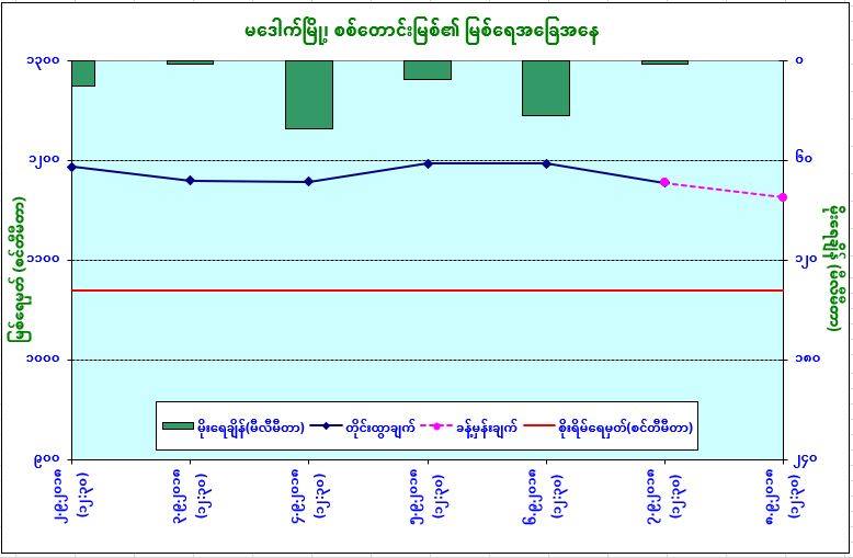 ယနေ့မြန်မာစံတော်ချိန် (၁၄:၃၀)နာရီအချိန် တိုင်းထွာချက်အရ ဒုဋ္ဌဝတီမြစ်ရေသည် မြစ်ငယ်မြို့တွင် ပေဝက်ခန့် ယင်းမြို့၏ စိုးရိမ်ရေမှတ်အထက်သို့ ကျော်လွန်နေပြီး နောက်(၁)ရက်အတွင်း ယင်းမြို့၏ စိုးရိမ်ရေမှတ်အောက်သို့ ပြန်လည်ကျဆင်း နိုင်ပါသည်။