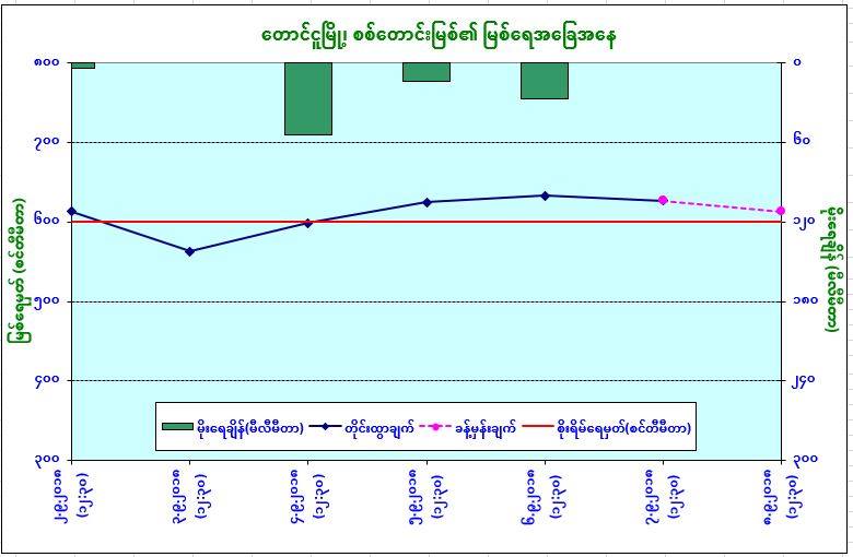 ယနေ့မြန်မာစံတော်ချိန် (၁၄:၃၀)နာရီအချိန် တိုင်းထွာချက်များအရ စစ်တောင်းမြစ်ရေသည် တောင်ငူမြို့တွင် (၁)ပေခန့်နှင့် မဒေါက်မြို့တွင် (၃)ပေခွဲခန့် ယင်းမြို့များ၏ စိုးရိမ်ရေမှတ်အသီးသီး အထက်သို့ ကျော်လွန်နေပြီး တောင်ငူမြို့နှင့် မဒေါက်မြို့တို့တွင် လက်ရှိရေမှတ်များမှ နောက်(၁) ရက် အတွင်း ပေဝက်ခန့်ကျဆင်းနိုင်ကာ ယင်းမြို့များ၏ စိုးရိမ်ရေမှတ်အသီးသီးအထက် ဆက်လက်တည်ရှိနိုင်ပါသည်။