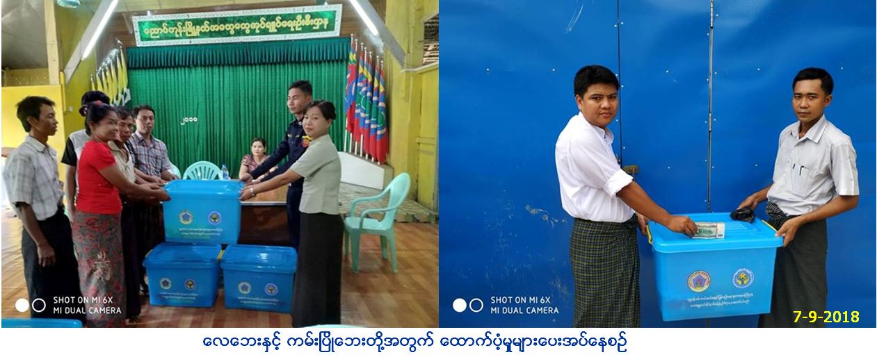 (၅) မအူပင်မြို့နယ်၊ မီးသွေးချောင်းကျေးရွာအုပ်စု၊ သောင်တန်းတာကွင်းကျေးရွာ၌ (၁၈ – ၈ -၂၀၁၈)ရက်နေ့တွင်ဖြစ်ပွားခဲ့သည့် ကမ်းပြို ဘေးကြောင့် ကြိုတင်ဖျက်သိမ်းပြောင်းရွှေ့ခဲ့သည့် နေအိမ် (၂)လုံး အိမ်ထောင်စု (၂)စုအတွက် ကယ်ဆယ်ရေးပစ္စည်း (၁၀)မျိုး အိမ်ဆောက် ပစ္စည်းဖိုးရန်ပုံငွေ (၂၀၀၀၀၀/-)ကျပ်နှင့် လူဦးရေ (၈)ဦးအတွက် ဆန်ရိက္ခာဖိုးရန်ပုံငွေ (၁၆၈၀၀/-)ကျပ်၊ စုစုပေါင်း ကယ်ဆယ်ရေး ရန်ပုံငွေ (၂၁၆၈၀၀/-)တို့အား (၀၈း၃၀)နာရီချိန်တွင် လည်းကောင်း အသီးသီးထောက်ပံ့ပေးအပ်ခဲ့ကြောင်း သတင်းရရှိပါသည်။