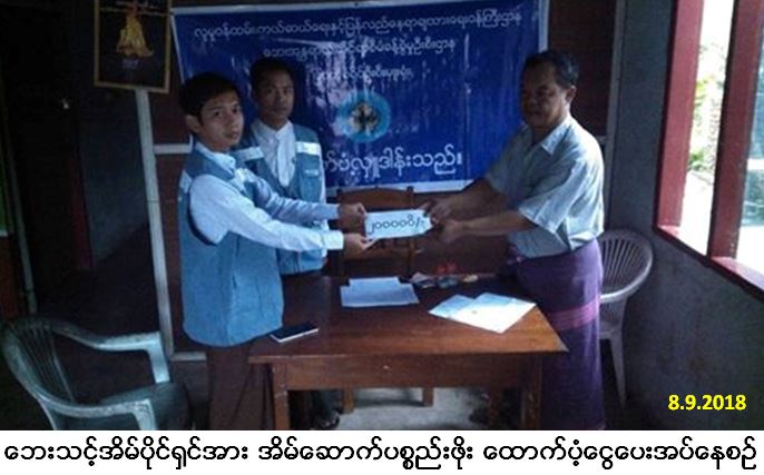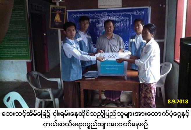 အဆိုပါဘေးသင့်အိမ်ခြေ၌ ငှါးရမ်းနေထိုင်သည့် အိမ်ထောင်စု (၁) စုမှ ကျား (၁) ဦး၊ မ (၁) ဦး၊ စုစုပေါင်း (၂) ဦးအား ဆန်ရိက္ခာဖိုး (၇) ရက်စာ (၄,၂၀၀/-) ကျပ်နှင့် ကယ်ဆယ်ရေးပစ္စည်း (၁၅) မျိုးပါ ပလပ်စတစ်ပုံး (၁) ပုံး အားလည်းကောင်း၊ အိမ်ပိုင်ရှင်အား အိမ်ဆောက်ပစ္စည်းဖိုး ထောက်ပံ့ငွေ (၂၀၀,၀၀၀/-) ကျပ်အားလည်းကောင်း၊ စုစုပေါင်းထောက်ပံ့ငွေ (၂၀၄,၂၀၀/-) ကျပ်အား (၈-၉-၂၀၁၈) ရက်နေ့၊ မွန်းလွဲ (၁၄း၀၀) နာရီအချိန်တွင် သင်္ဃန်း ညီနောင်အုပ်ချုပ်ရေးမှူးရုံး၌ ထောက်ပံ့ပေးအပ်ခဲ့ကြောင်း သတင်းရရှိပါသည်။