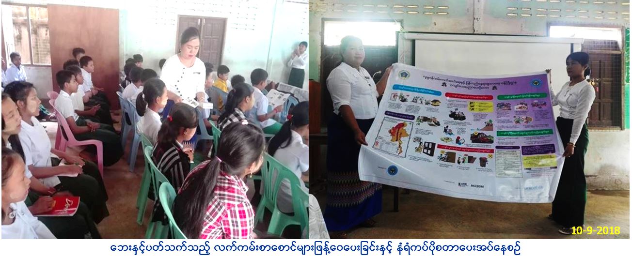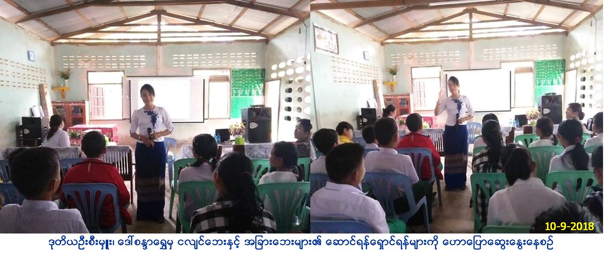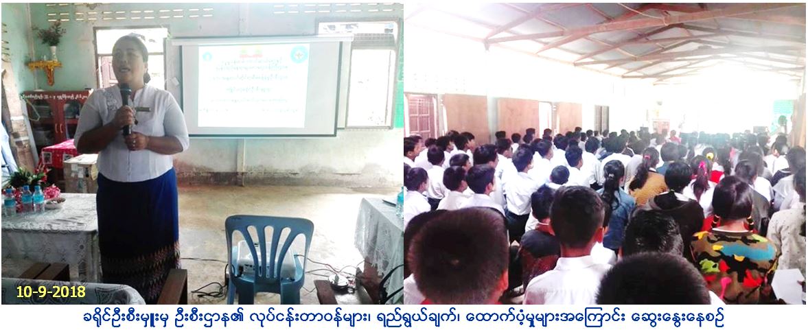 လူမှုဝန်ထမ်း၊ ကယ်ဆယ်ရေးနှင့် ပြန်လည်နေရာချထားရေးဝန်ကြီးဌာန၊ ဘေးအန္တရာယ်ဆိုင်ရာစီမံခန့်ခွဲမှုဦးစီးဌာန၊ ကျိုင်းတုံခရိုင်ဦးစီးမှူးရုံးမှ တာဝန်ရှိသူများသည် (၁၀.၉.၂၀၁၈)ရက်နေ့ နံနက် (၁၀း၀၀)နာရီမှ (၁၂း၀၀)နာရီအထိ တာချီလိတ်မြို့နယ်၊ အထက-ခွဲ ပုန်းထွန်တွင် ကျောင်းသူ၊ ကျောင်းသား စုစုပေါင်း (၁၆၀)ဦးအား ခရိုင်ဦးစီးမှူးမှ ဦးစီးဌာန၏ လုပ်ငန်းတာဝန်များ၊ ရည်ရွယ်ချက်၊ ထောက်ပံ့မှုများအကြောင်း ကိုလည်းကောင်း၊ ဒုတိယဦးစီးမှူး၊ ဒေါ်စန္ဒာရွှေမှ ငလျင်ဘေးနှင့် အခြားဘေးများ၏ ဆောင်ရန်ရှောင်ရန်များကို ဟောပြောဆွေးနွေးခဲ့ပြီး လက်ကမ်းစာစောင် များဖြန့်ဝေပေးခြင်းနှင့် နံရံကပ်ပိုစတာပေးအပ်ခြင်း များဆောင်ရွက်ခဲ့ကြောင်း သတင်းရရှိပါသည်။