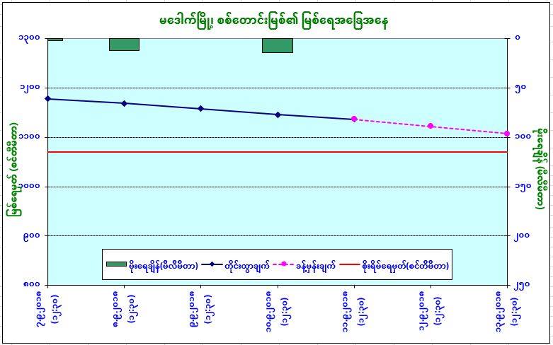 ယနေ့မြန်မာစံတော်ချိန် (၁၃:၃၀)နာရီအချိန် တိုင်းထွာချက်အရ စစ်တောင်းမြစ်ရေသည် မဒေါက်မြို့တွင် (၂)ပေခန့် ယင်းမြို့၏ စိုးရိမ်ရေမှတ်အထက်သို့ ကျော်လွန်နေပြီး လက်ရှိရေမှတ်မှ နောက်(၂)ရက်အတွင်း (၁)ပေခန့် ကျဆင်းနိုင်ကာ ယင်းမြို့၏ စိုးရိမ်ရေမှတ်အထက် ဆက်လက်တည်ရှိ နိုင်ပါသည်။